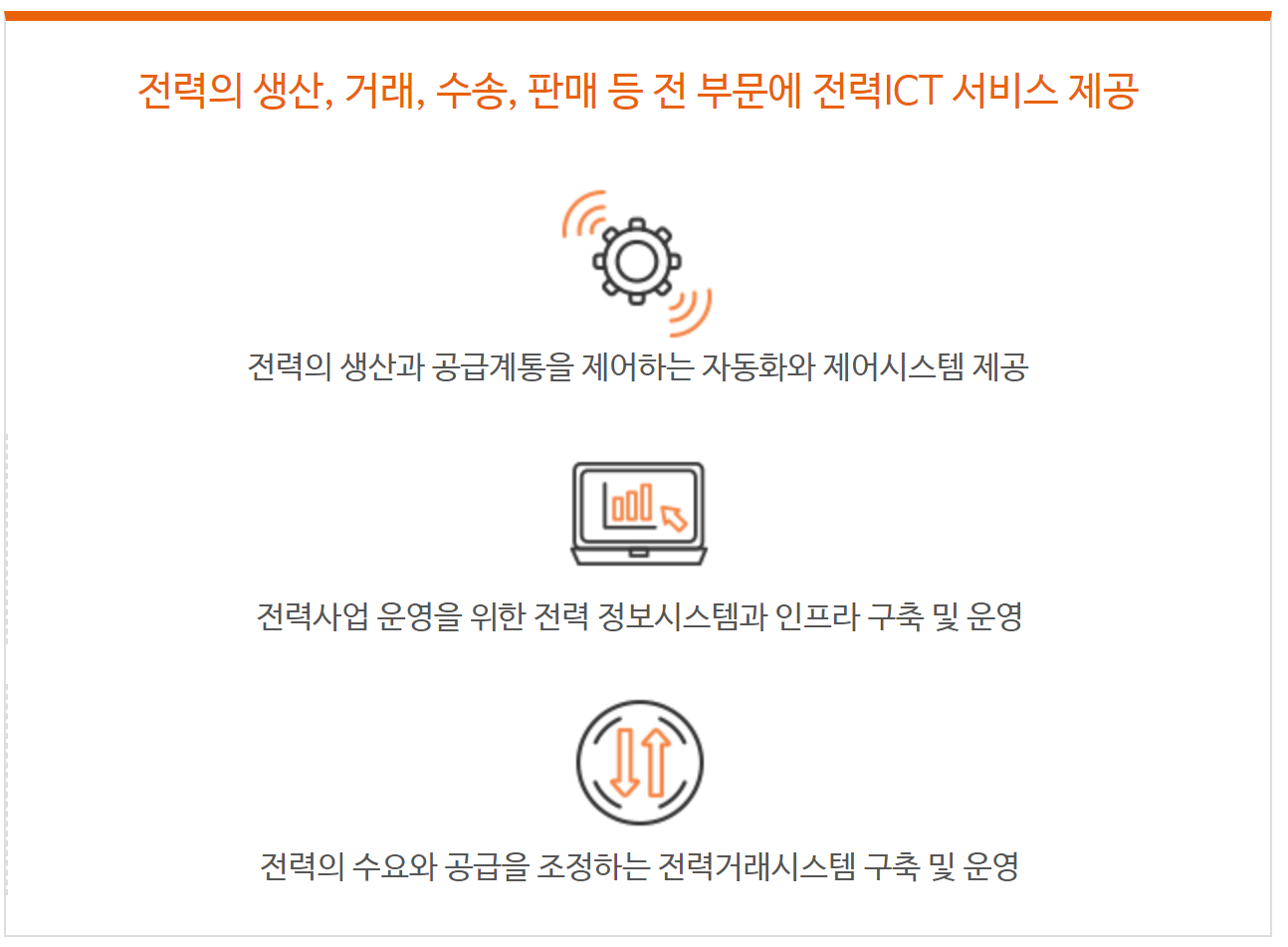 한전KDN 사업분야를 보면 전력의 생산, 거래, 수송, 판매 모든 활동에서 전력 ICT (information and communications technology, 정보통신기술) 서비스를 제공하고 있으며