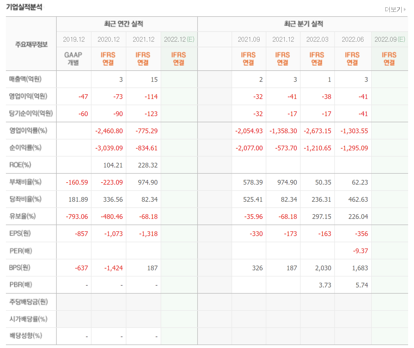 매출은 작년에 15억 발생하였고 영업이익 당기순이익 모두 큰 적자를 유지하고 있습니다. 부채비율도 매우 높고 유보율은 마이너스인 상태입니다. 정치테마주를 할 때 이런 종목이 더 급등이 나오는 경우는 있으나 왠만하면 이런 종목은 피하는 것이 좋습니다.