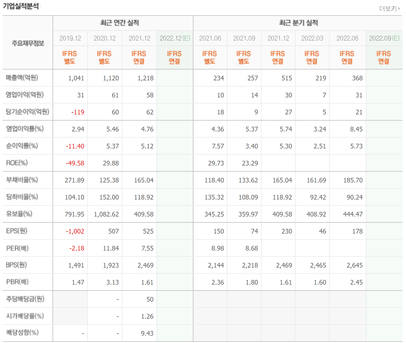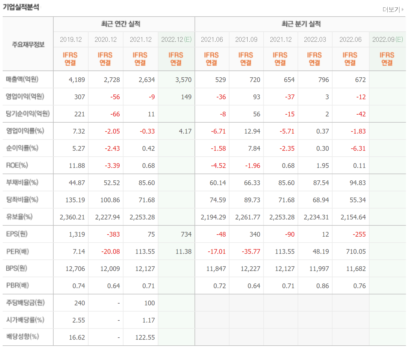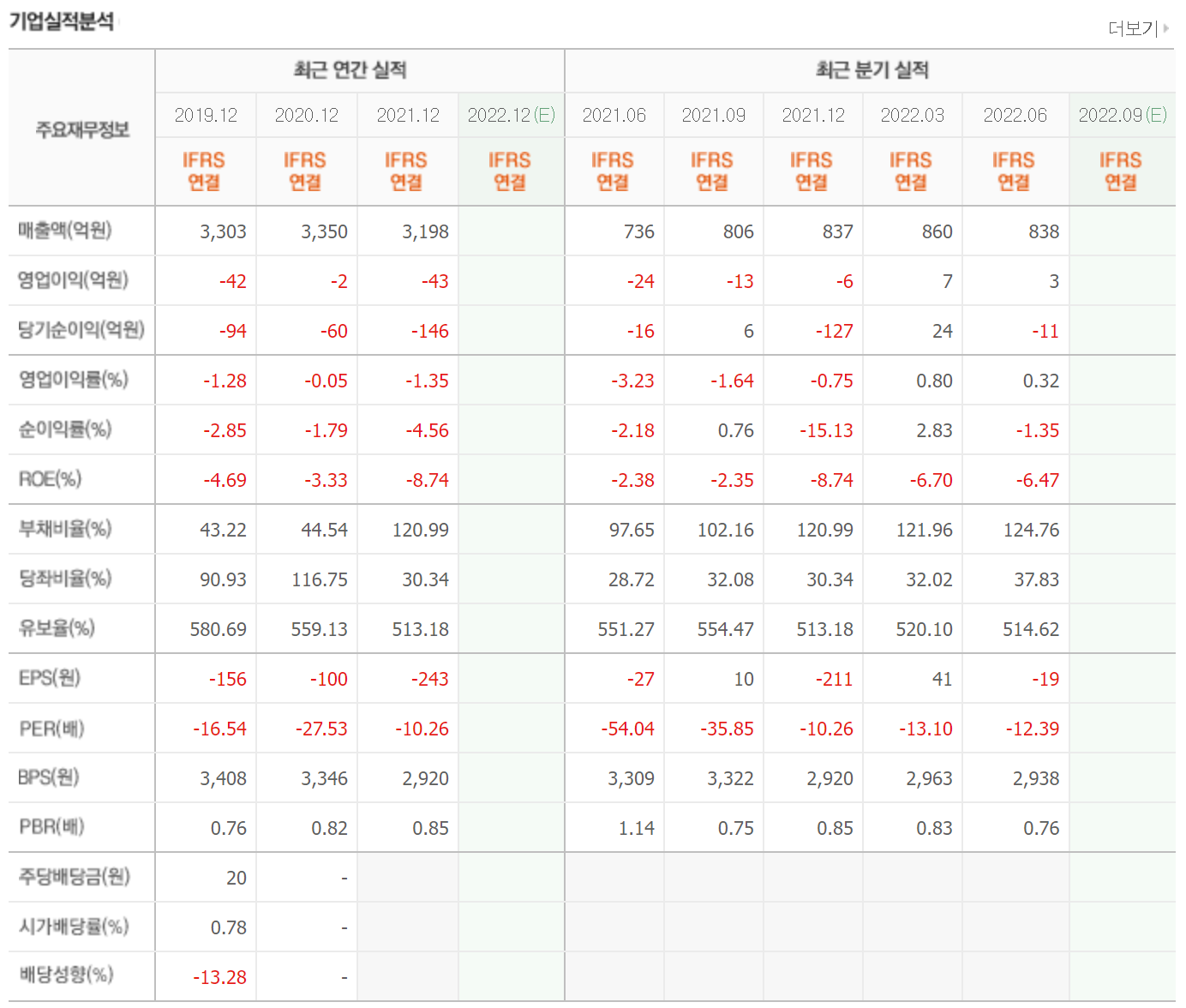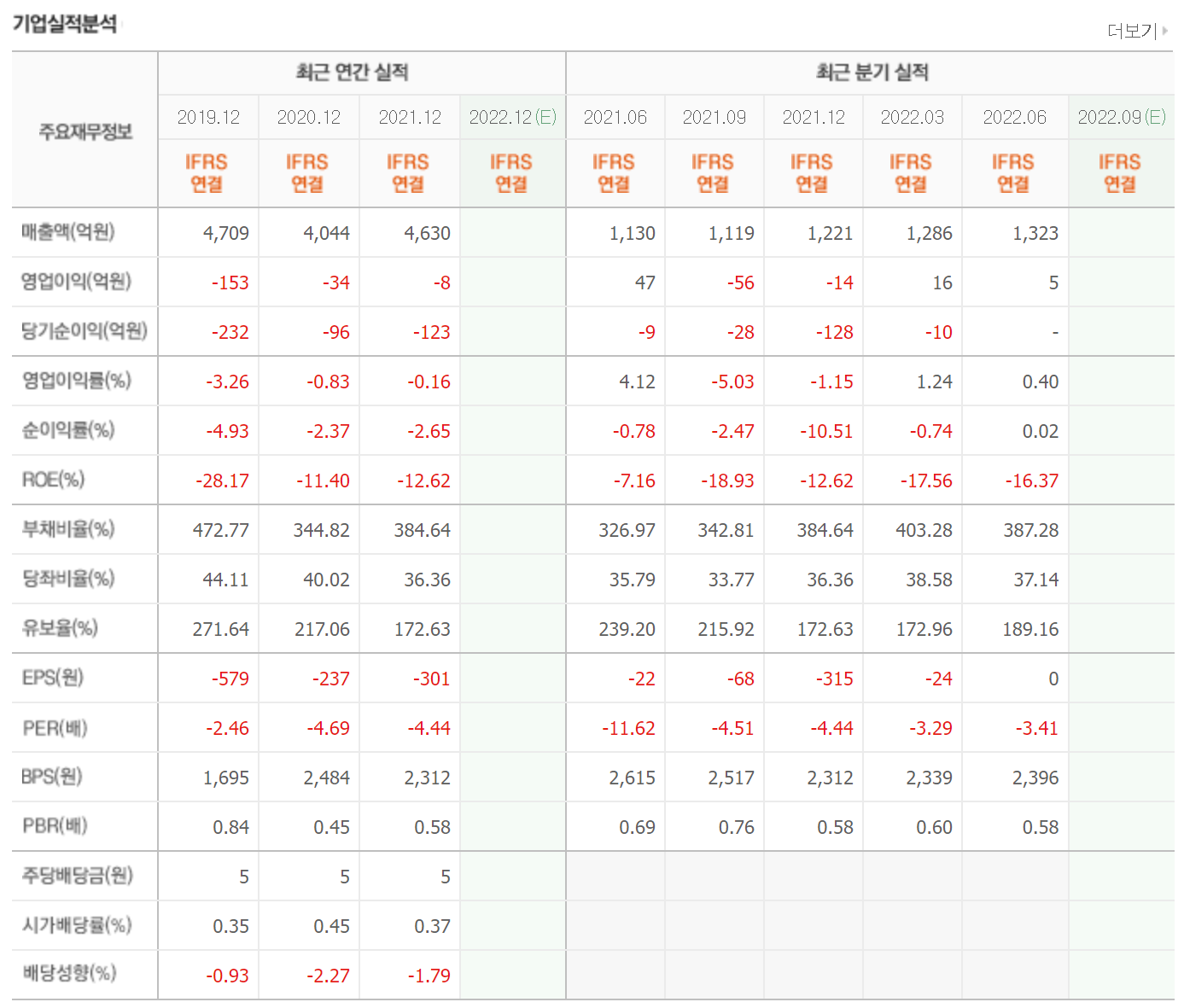 매출은 4000억대를 유지하고 있습니다. 영업이익은 적자를 유지하고 있으나 다소 감소하고 있는 상황입니다. 하지만 당기순이익은 지속적으로 적자를 유지하고 있습니다. 부채비율은 다소 높은편이며 유보율도 낮은 편입니다.