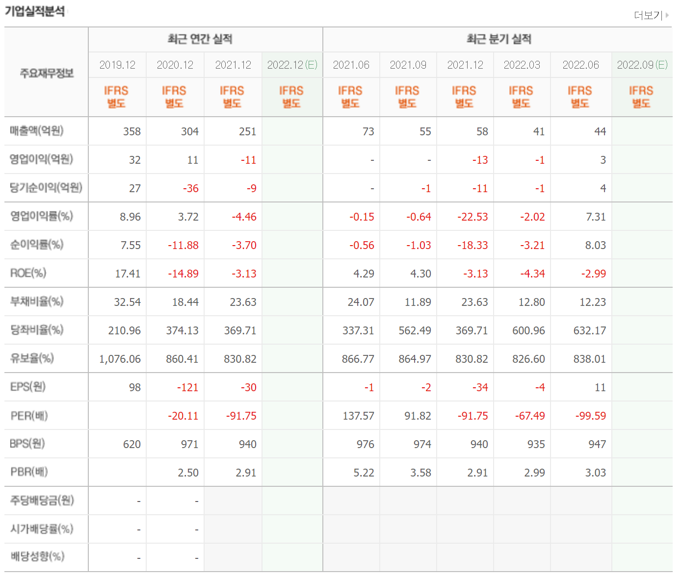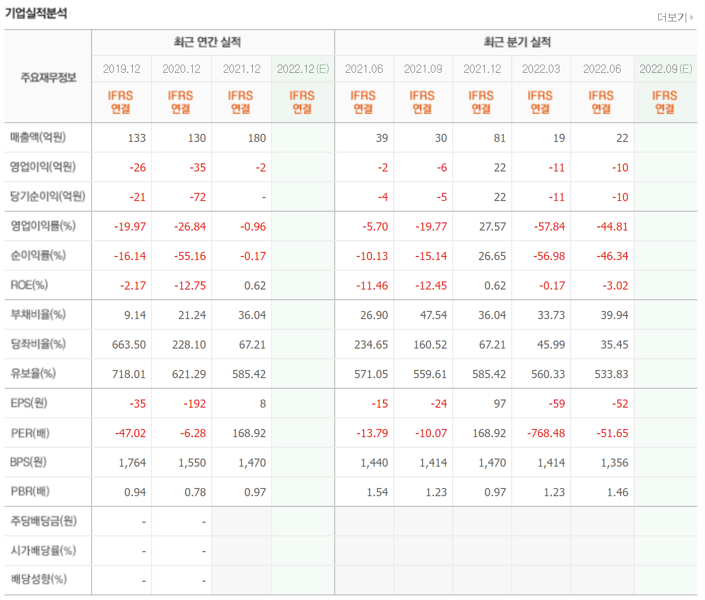 연 매출은 130억에서 180억 정도 발생하고 있고 영업이익과 당기순이익은 모두 적자를 유지하고 있습니다. 현재 사업 자체가 리튬 사업을 직접적으로 하고 있지않아 현재 미래 가치가 실적에 반영되어 있지 않은 상태입니다. 이런 종목은 미래 가치를 위한 투자가 이루어지는 편이 많습니다.