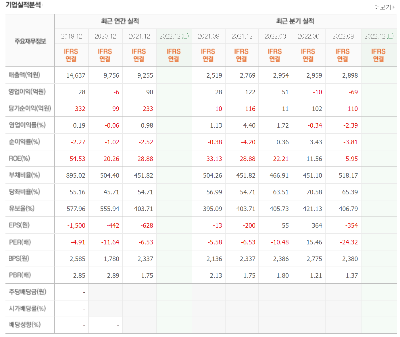 매출은 2019년까지 1조를 넘기고 있었으나 현재는 1조 이하의 매출을 발생시키고 있습니다. 당기순이익은 지속적으로 적자를 유지하고 있는 상태입니다.