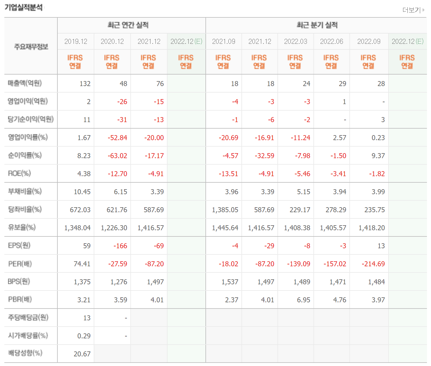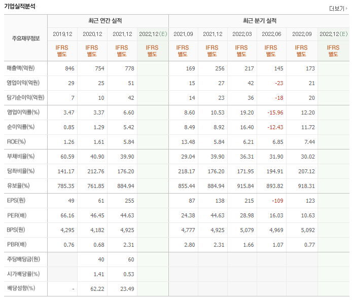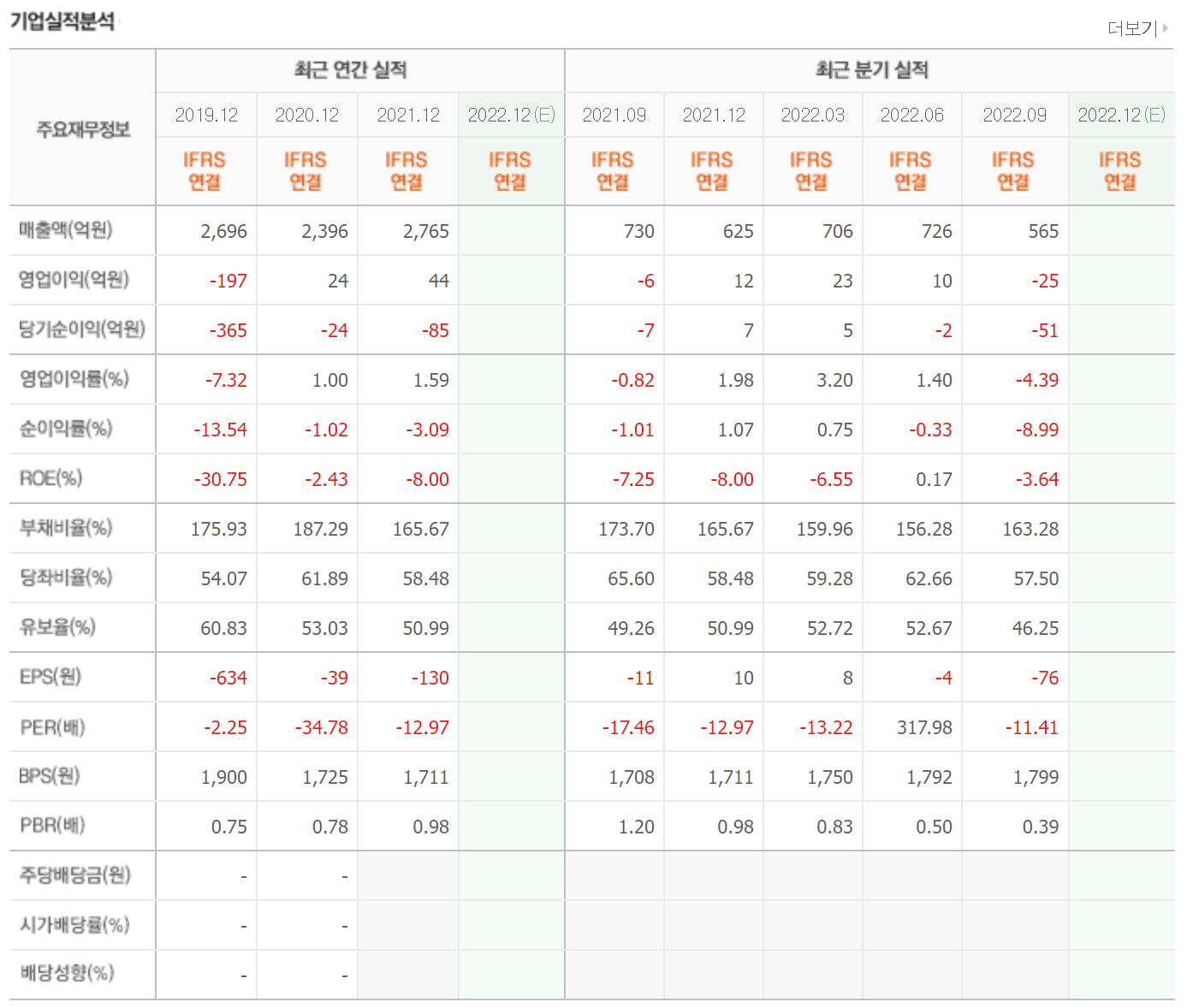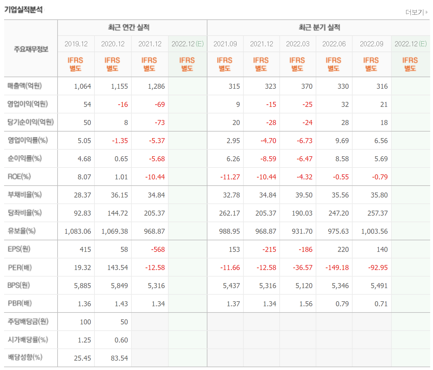 매년 2000억대 매출올 올리고 있으며 영업이익은 2년 연속 흑자이나 당기순이익은 3년 연속 적자를 유지하고 있습니다. 유보율과 부채비율은 다소 위험한 수준을 유지하고 있습니다.