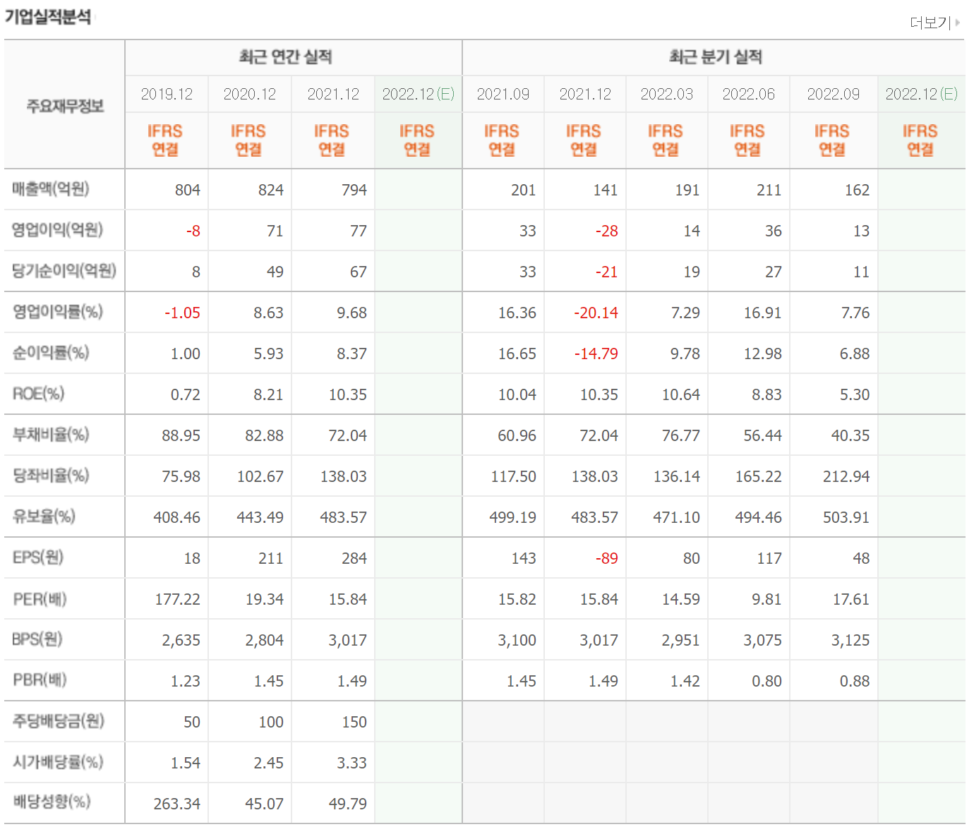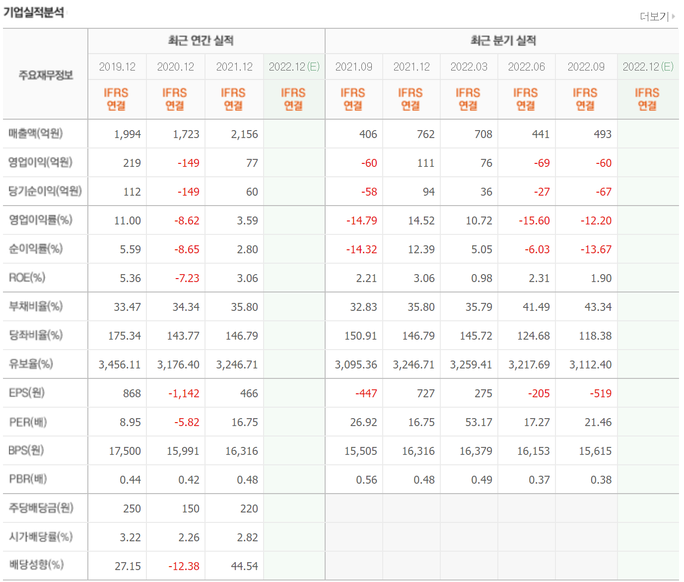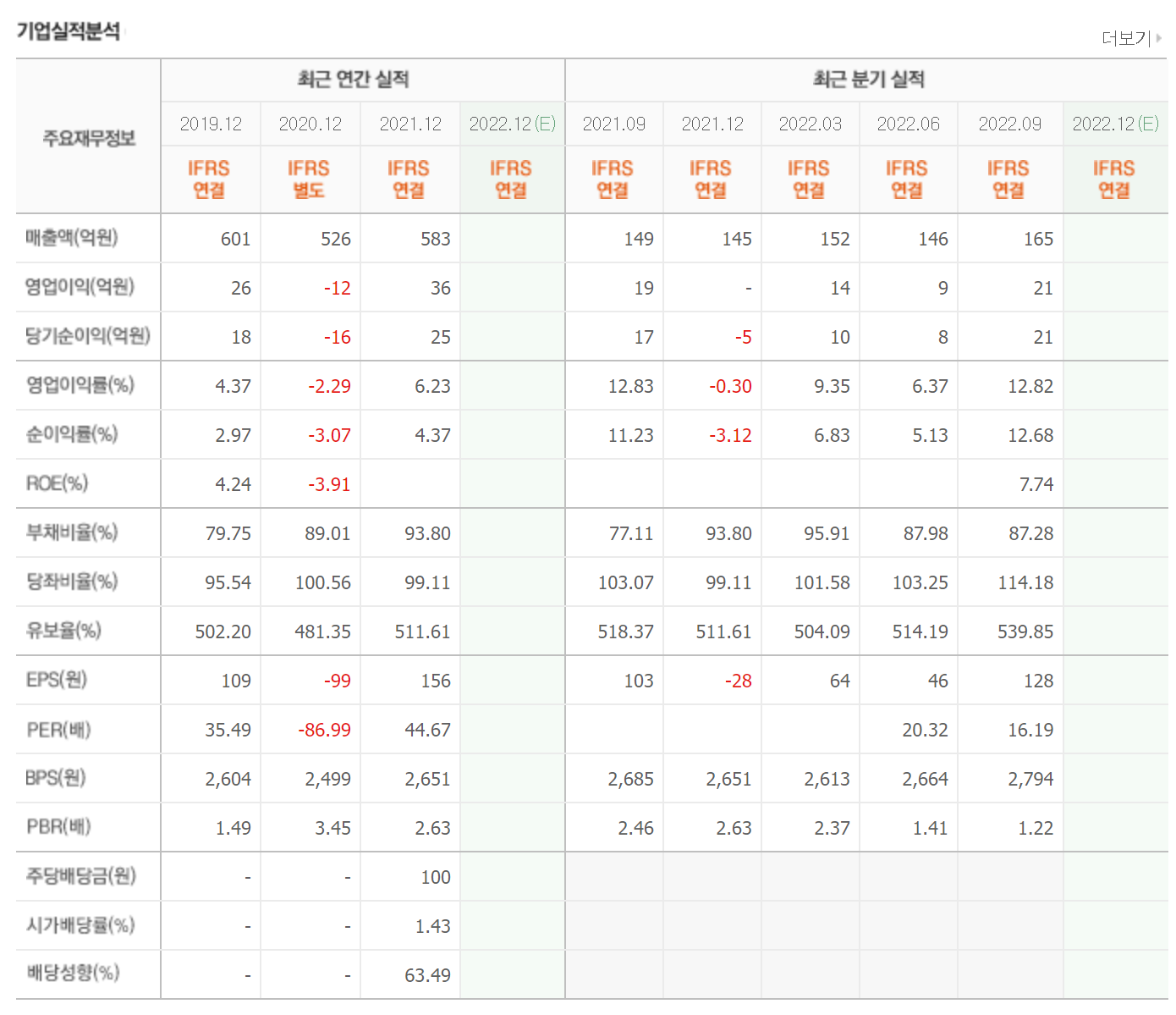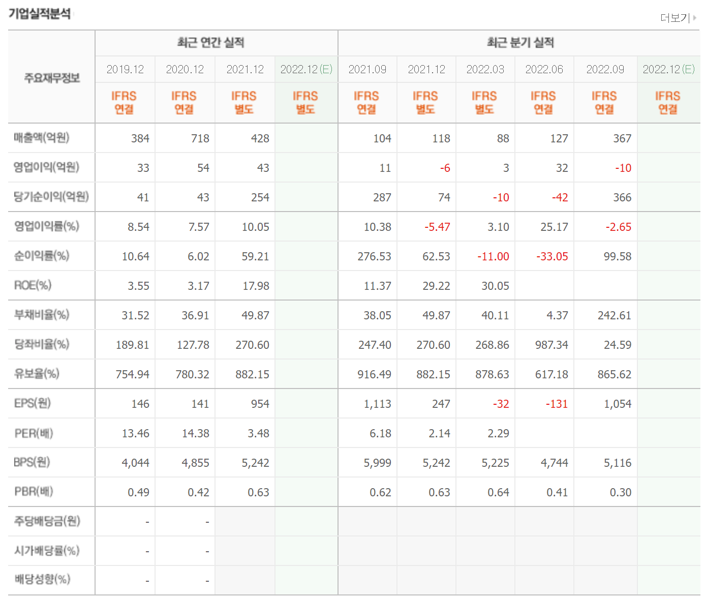 매년 2000억대 매출올 올리고 있으며 영업이익은 2년 연속 흑자이나 당기순이익은 3년 연속 적자를 유지하고 있습니다. 유보율과 부채비율은 다소 위험한 수준을 유지하고 있습니다.