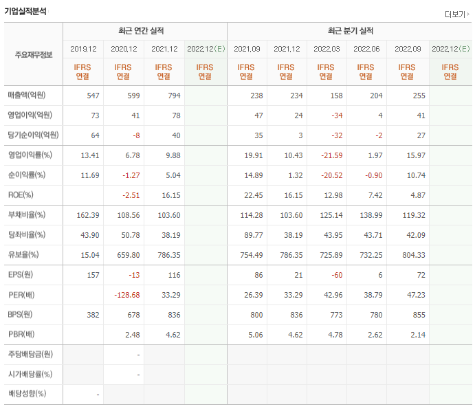 2019년 500억대 매출을 시작으로 2021년 800억대 매출을 올리며 성장중 영업이익은 3년 연속 흑자를 유지하고 있으며 당기순이익은 2021년 흑자전환하였습니다. 유보율과 부채비율 모두 안정적인 상태를 유지 중입니다.