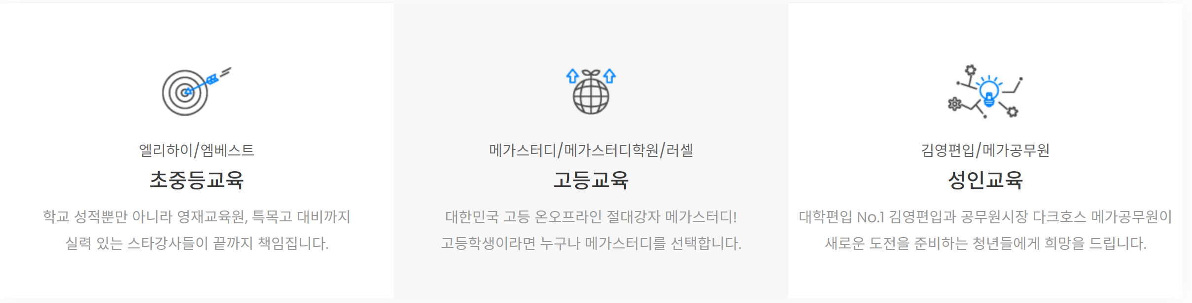 초중등교육, 고등교육, 성인교육에 걸쳐 다양한 그룹사들이 있으며 메가스터디의 경우 고등교육에 특화된 사업을 영위하고 있어 교육 관련주로 편입되어 있습니다.