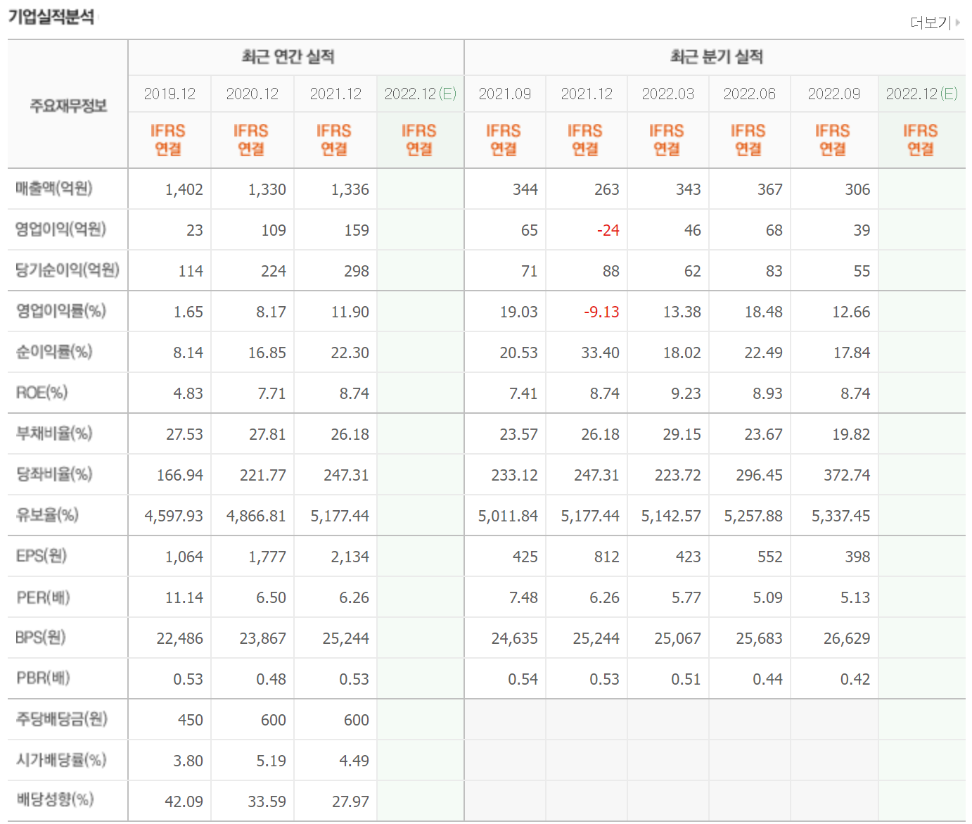 매년 1000억 대 매출을 달성하고 있으나 영업이익과 당기순이익은 적자전환하였습니다. 유보율과 부채비율은 나쁘지 않은 편입니다.
