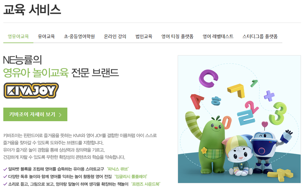 NE능률은 키바조이, 엔이키즈등 유아교육, 초중등영어교육 서비스를 제공하고 있어 교육 관련주로 편입되어 있습니다.