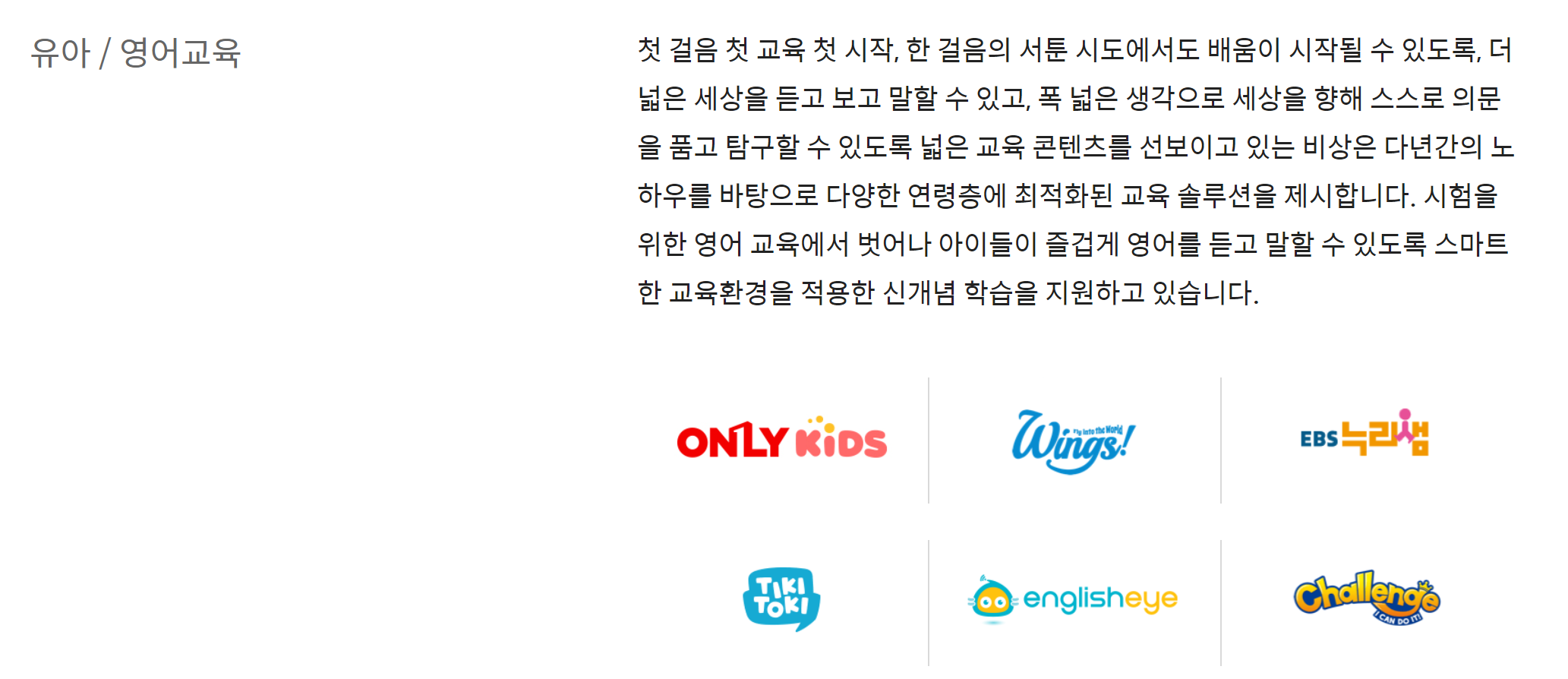 '아이스크림홈런'을 기반으로 중등대상의 '홈런중등', 예비초등생 대상의 '리틀홈런', 공부방용 '홈런 스마트 학습센터' 등으로 서비스 영역 확장하고 있습니다.