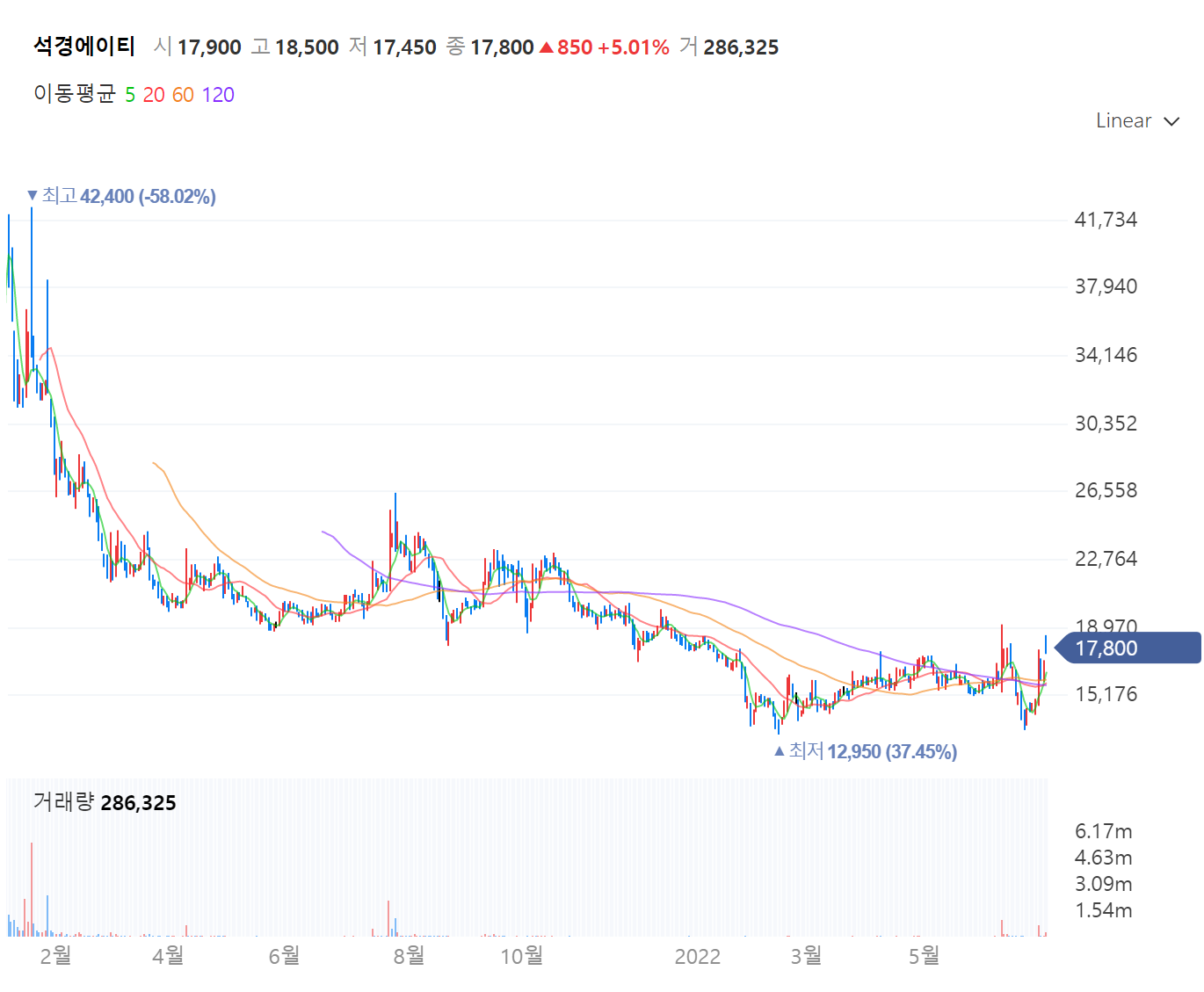 석경에이티 일봉입니다.