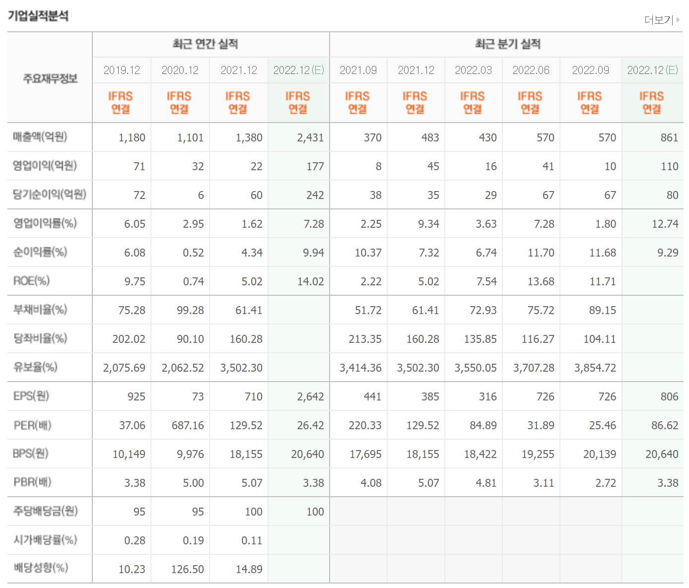 매년 1000억 매출을 달성하고 있고 2022년 컨센서스 기준으로 2400억 매출을 올릴 것으로 예측되고 있습니다. 영업이익과 당기순이익도 모두 흑자를 유지 중 입니다.