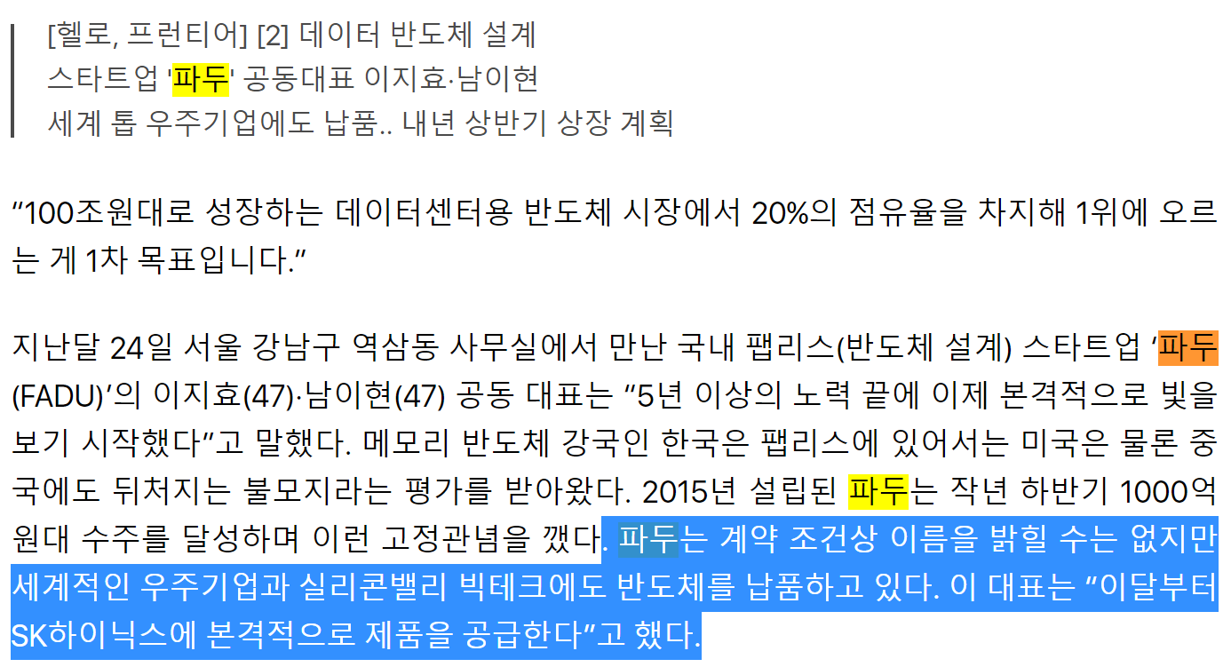 컴퍼니케이에서 투자하고 있는 스타트업 파두에서 세계적인 우주기업에 반도체를 납품하고 있다는 소식이 뉴스로 전해진 적이 있습니다. 계약 조건상 이름을 밝힐 수 없지만 이 기업이 스페이스엑스인 것으로 추정하고 있습니다. 현재 소문으로만 움직이는 종목이기 때문에 투자에 조심할 필요는 있습니다.