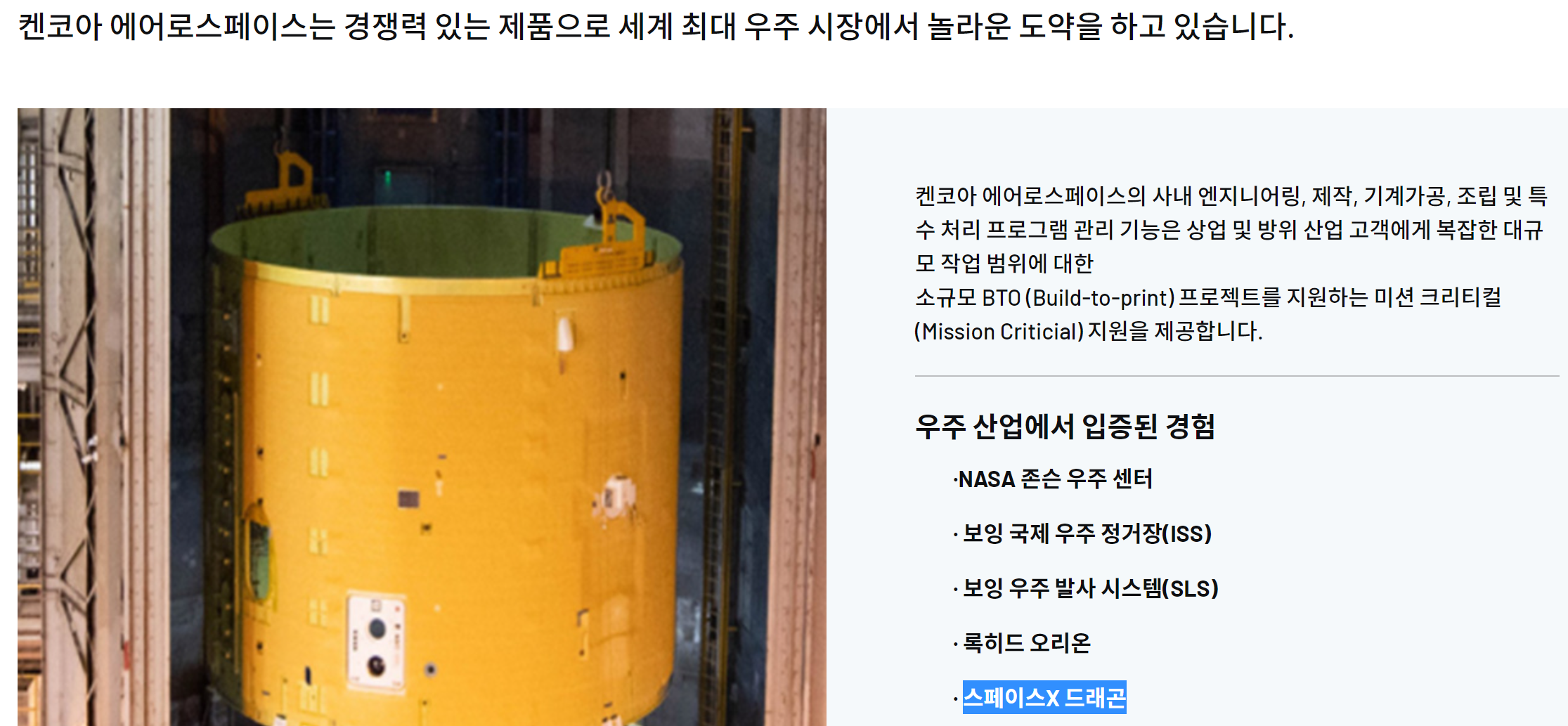 켄코아에어로스페이스 관계사인 켈리포니아 메탈(California Metal)은 스페이스엑스(Space X) 벤더 코드 등록을 하고 원소재 공급계약을 체결했습니다. 나사(NASA)와 스페이스엑스, 블루오리진(Blue Origin) 등에 우주특수원소재를 공급하고 있어 스타링크 관련주로 편입되어 있습니다.