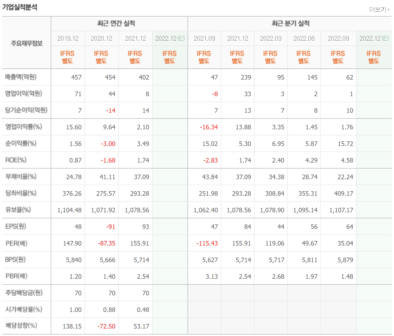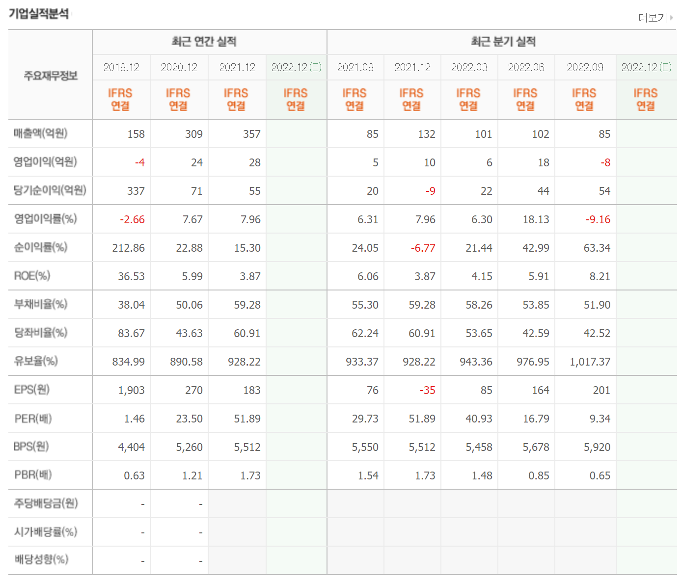 매년 400억에서 500억 대 매출을 올리고 있으며 지속적으로 영업이익과 당기순이익은 적자 상태이나 2022년 컨센서스 기준으로 흑자 전환할 것으로 예측되고 있습니다. 유보율과 부채비율은 안정적인 상태는 아닙니다.