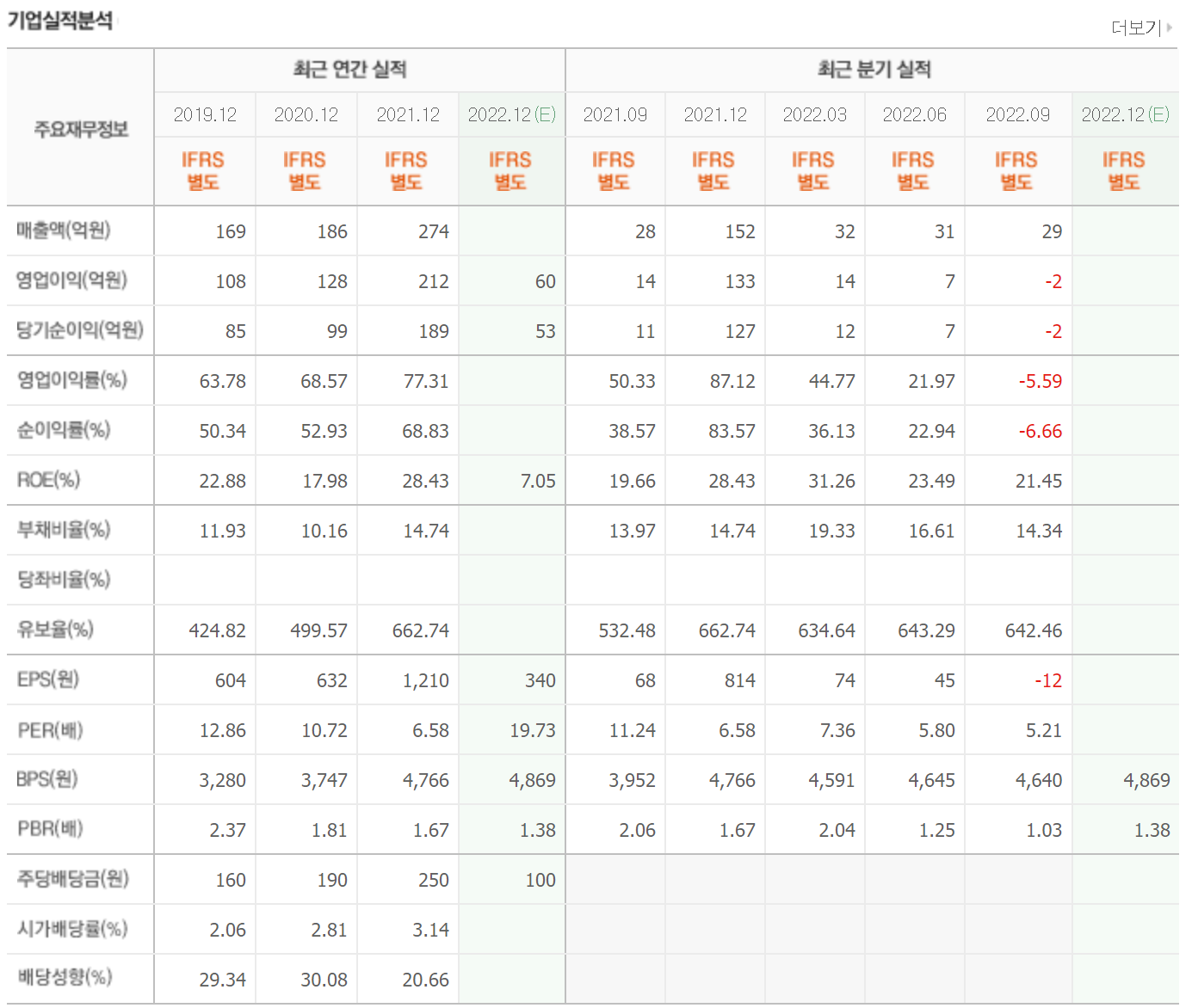 매년 100억에서 200억의 매출을 발생시키고 있으며 영업이익과 당기순이익은 매출대비 상당히 높은 편입니다. 유보율과 부채비율은 준수한 수준을 유지하고 있습니다.