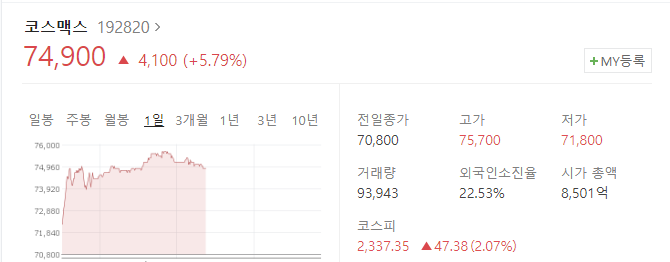 코스맥스는 서울메이드 브랜드에서 색조화장품을 판매하고 있습니다. 이에 수혜 기대감으로 관련주로 편입되어 있습니다.