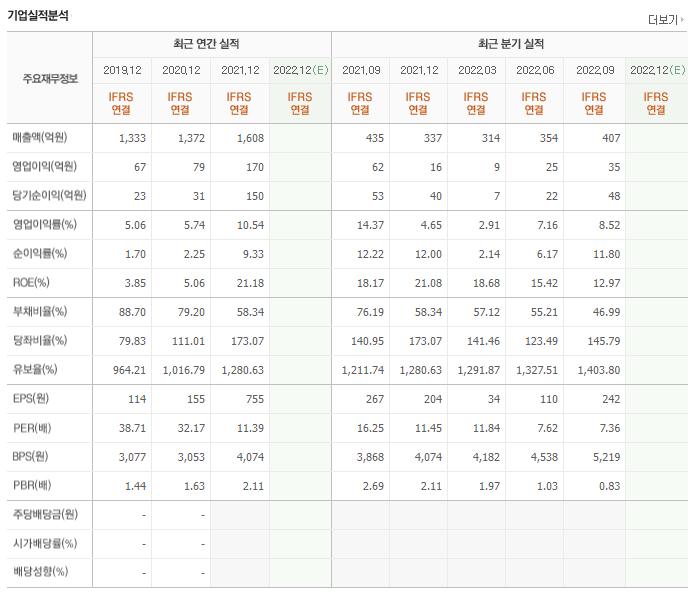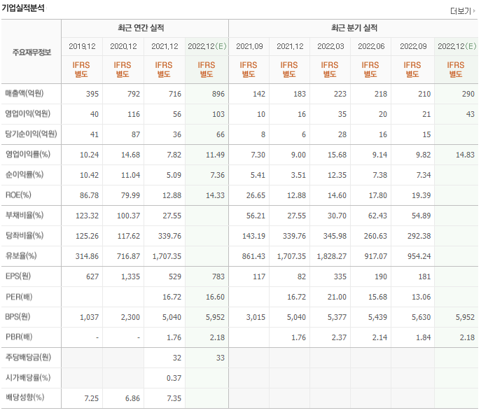 매년 천억 중반대의 매출을 발생시키고 있으며 영업이익은 흑자를 유지하고 있으나 당기순이익은 2년 연속적자를 기록하고 있습니다. 유보율과 부채비율은 우수한 편입니다.