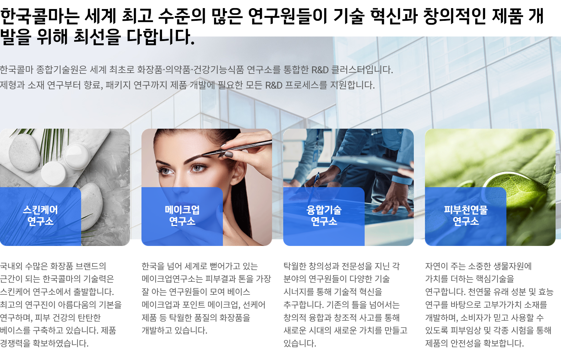CGMP 인증은 물론 국제규격인 ISO 22716 인증까지 획득하며, 글로벌시장에 맞는 기업으로의 개선을 완료하였습니다. 산하 기술개발연구원에서 스킨케어본부, 메이크업본부, 리서치본부와 함께 연구협력팀을 두어 제품을 개발하고 있음습니다.