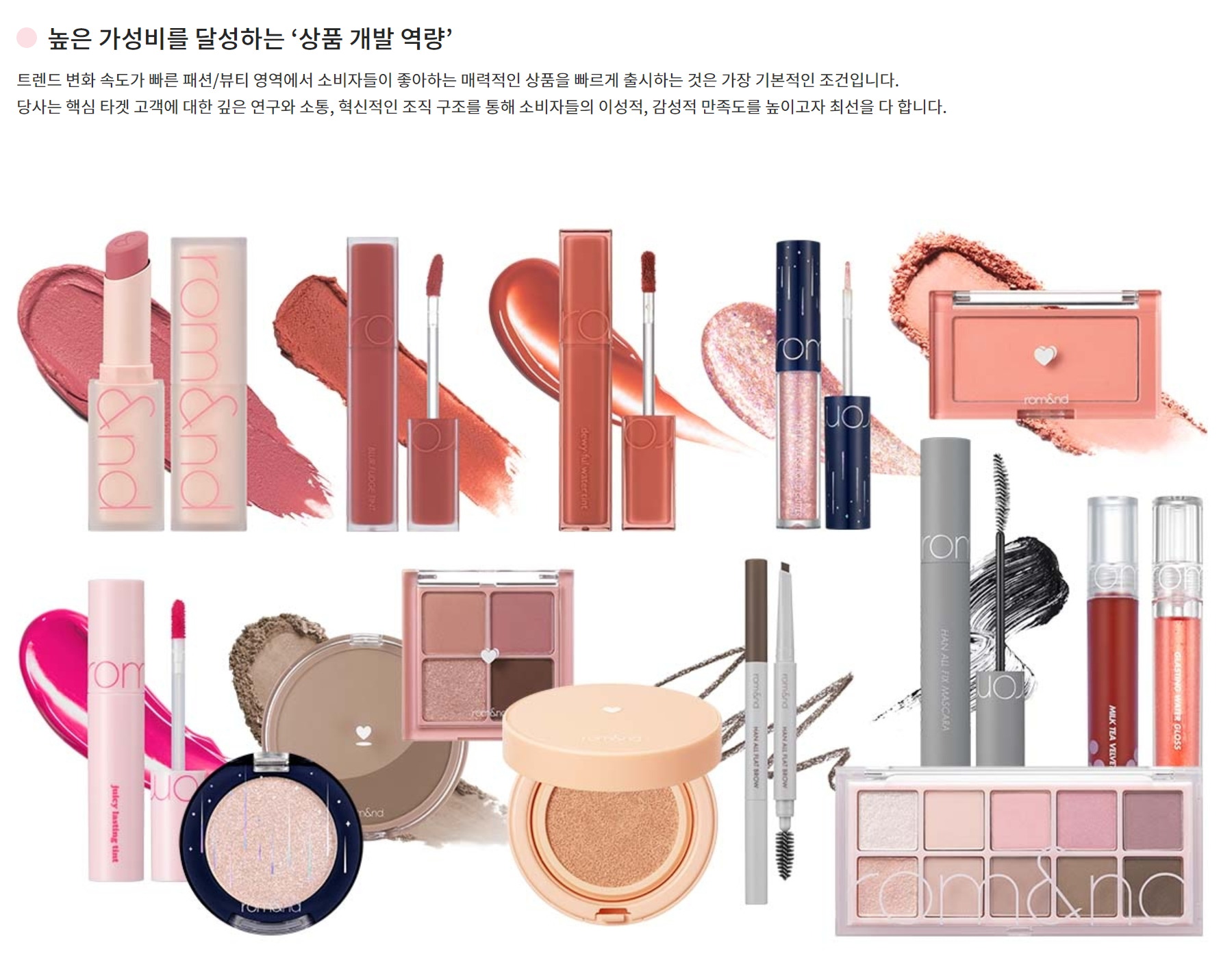 가장 많은 비중을 차지하고 있는 색조화장품 브랜드 '롬앤(Rom&nd)'과 초창기 사업의 근간을 이루었던 IT기반 웨딩서비스 플랫폼 '아이웨딩(iwedding)'을 중심으로 뷰티&생활 분야의 사업을 영위하고 있습니다.
