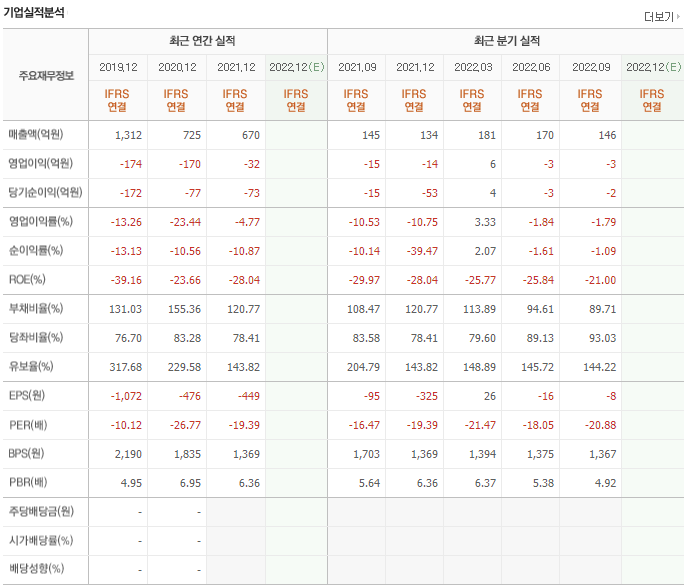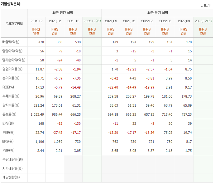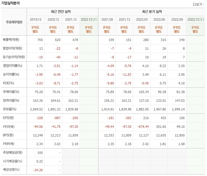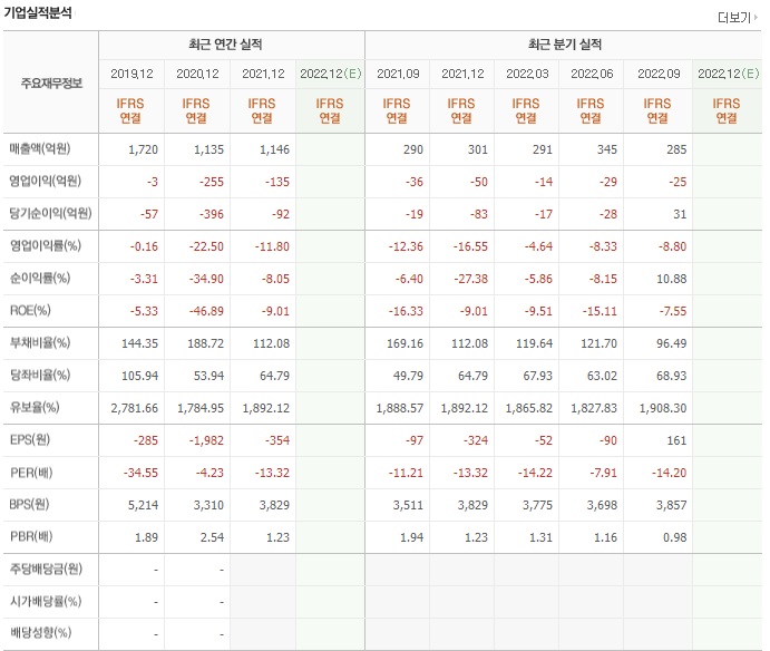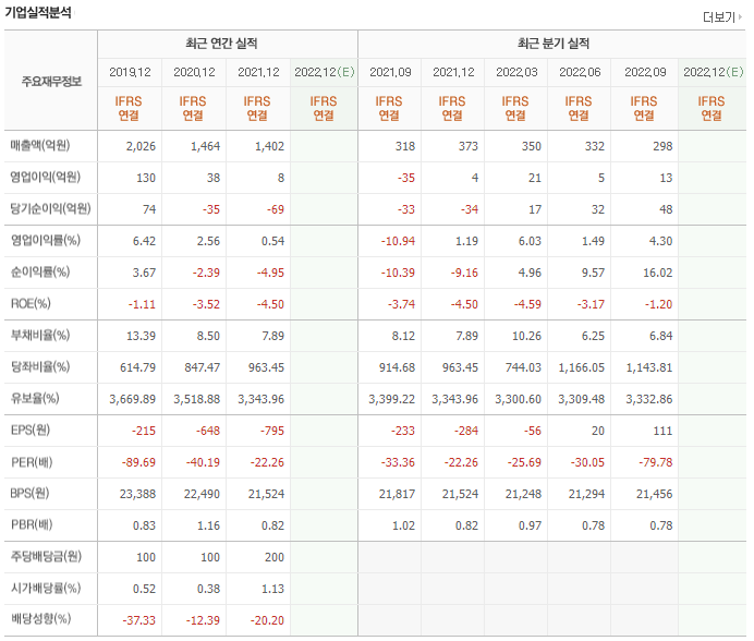 2019년 1000억대 매출을 달성한 이후 매출이 지속적으로 감소하고 있씁니다. 영업이익과 당기순이익 모두 3년 연속 적자를 기록하고 있습니다. 유보율도 다소 낮은 편이고 부채비율도 높진 않지만 유보율과 비교해봤을 때 위험한 위치입니다.