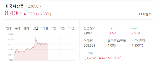한국화장품은 한국화장품제조에서 화장품판매 및 부동산임대사업부문이 분할하여 설립된 기초 및 색조화장품 판매를 영위하는 종합화장품회사입니다.