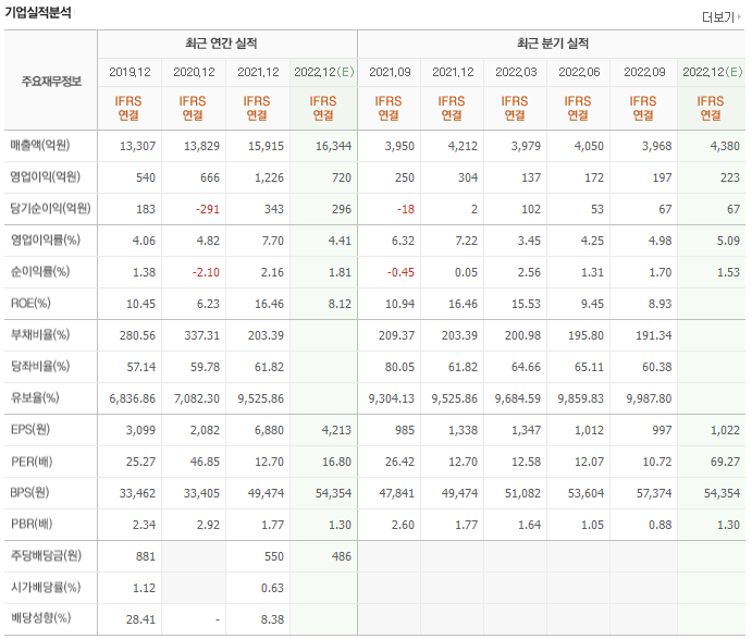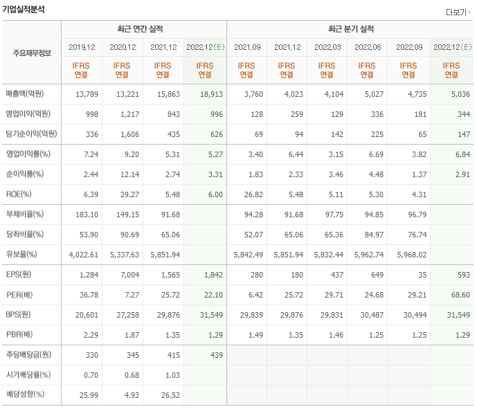 매년 1조 중반대 매출을 올리고 있으며 영업이익과 당기순이익은 흑자를 유지중입니다. 유보율과 부채비율 모두 우수한 수준을 유지 중입니다.
