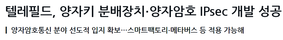 텔레필드는 DV-QKD 기반 양자키 분배장치와 양자암호 키 관리 시스템, 양자암호 기반 IP 보안장비(Q-IPSec) 상용 시스템 개발에 성공했습니다. 이는 양자암호기술 전문 자회사 에프아이시스와 함께 한국과학기술정보연구원(KISTI) 개발 과제를 수행한 성과이며 텔레필드 QKD와 Q-IPsec 시스템은 올해 KISTI 국가과학기술연구망(크레오넷)에 시험망 적용을 거쳐 양자암호 기반 국가연구망 서비스에 단계적으로 제공될 계획인데요. 이에 텔레필드가 양자암호 관련주로 편입되었습니다.