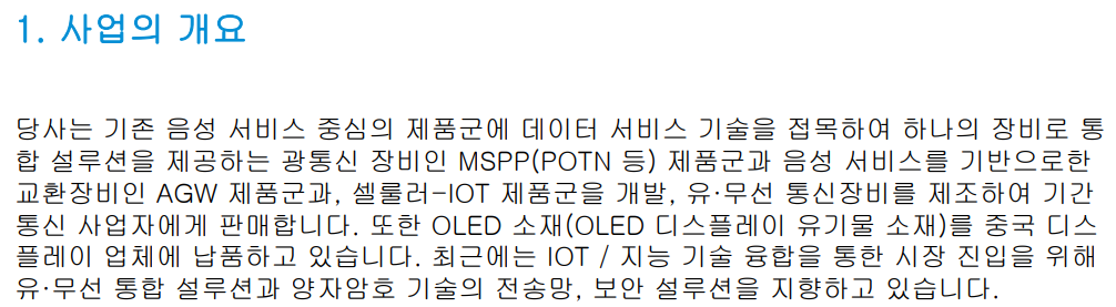 2000년 삼성전자 네트워크부문 출신 연구원들이 주축이 되어 설립되었습니다. 주요 매출처는 KT, SK브로드밴드 등 기간통신사업자이며 광통신장비인 MSPP, 음성서비스 기반의 AGW장비 등을 판매하고 있습니다. 기존 MSPP 장비에 WDM 기능 추가로 개발 및 사업화 추진 중으로 Metro DWDM 시장에 적용 중이며 2011년 이후 Carrier Ethernet 장비가 신규로 등장하여 시장이 확대되고 있습니다.