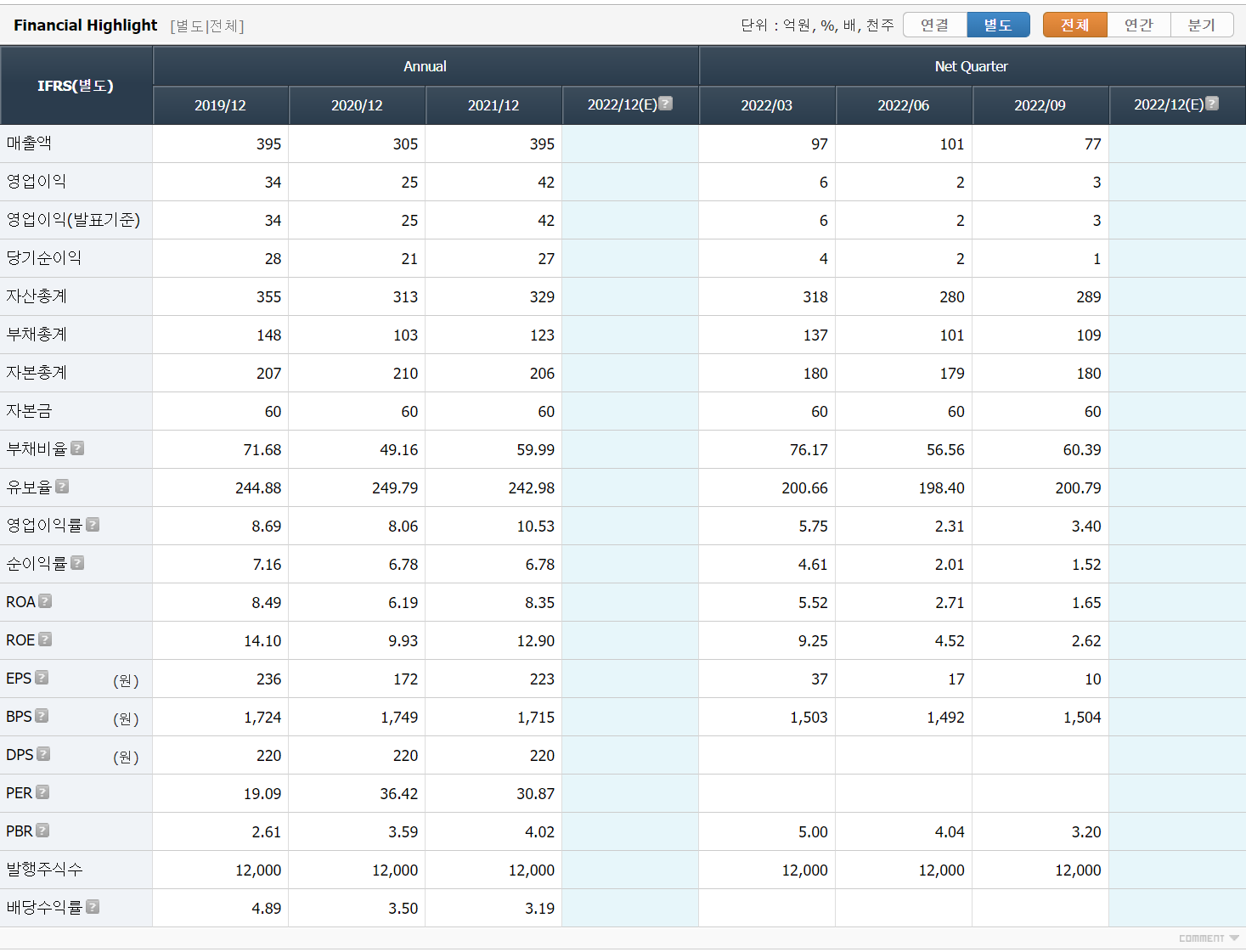 매년 300억 대 매출을 발생시키고 있으며 영업이익과 당기순이익 모두 흑자를 유지하고 있씁니다. 유보율은 다소 낮은편이나 부채비율도 크게 높지 않은 상태입니다.