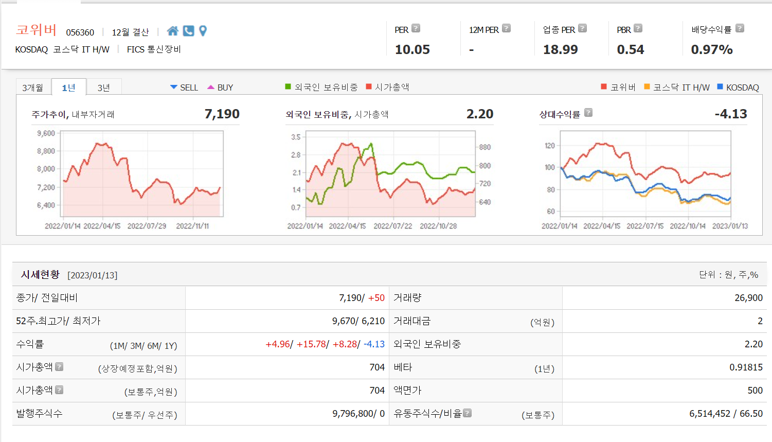 코위버는 2019년 1000억 매출을 달성 후 2020년과 2021년 800억대 매출을 유지하고 있습니다. 영업이익과 당기순이익은 감소추세이나 흑자를 유지하고 있습니다. 유보율과 부채비율은 우수한 편입니다.