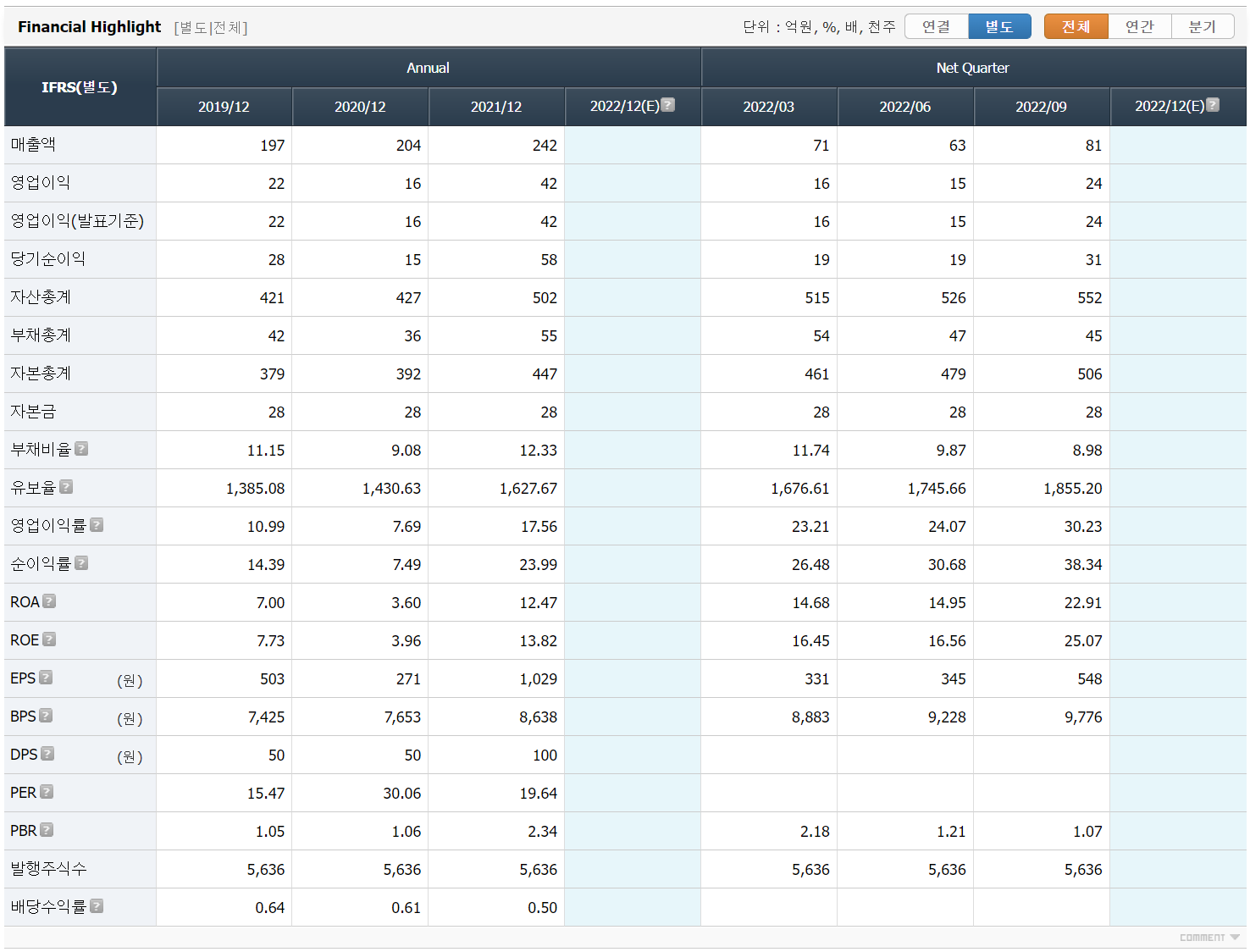 매년 300억 대 매출을 발생시키고 있으며 영업이익과 당기순이익 모두 흑자를 유지하고 있씁니다. 유보율은 다소 낮은편이나 부채비율도 크게 높지 않은 상태입니다.