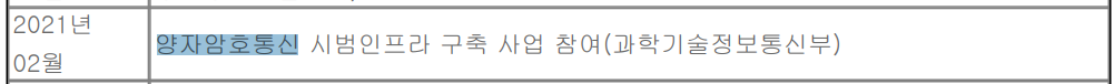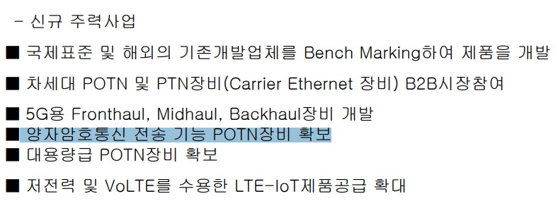 사업개요에서도 양자암호 기술의 전송망 보안솔루션을 지향하고 있고 신규 주력 사업에 양자암호통신 관련 사업이 포함되어 있습니다. 또. 2021년 양자암호통신 시범인프라 구축 사업에 도 참여하였습니다.