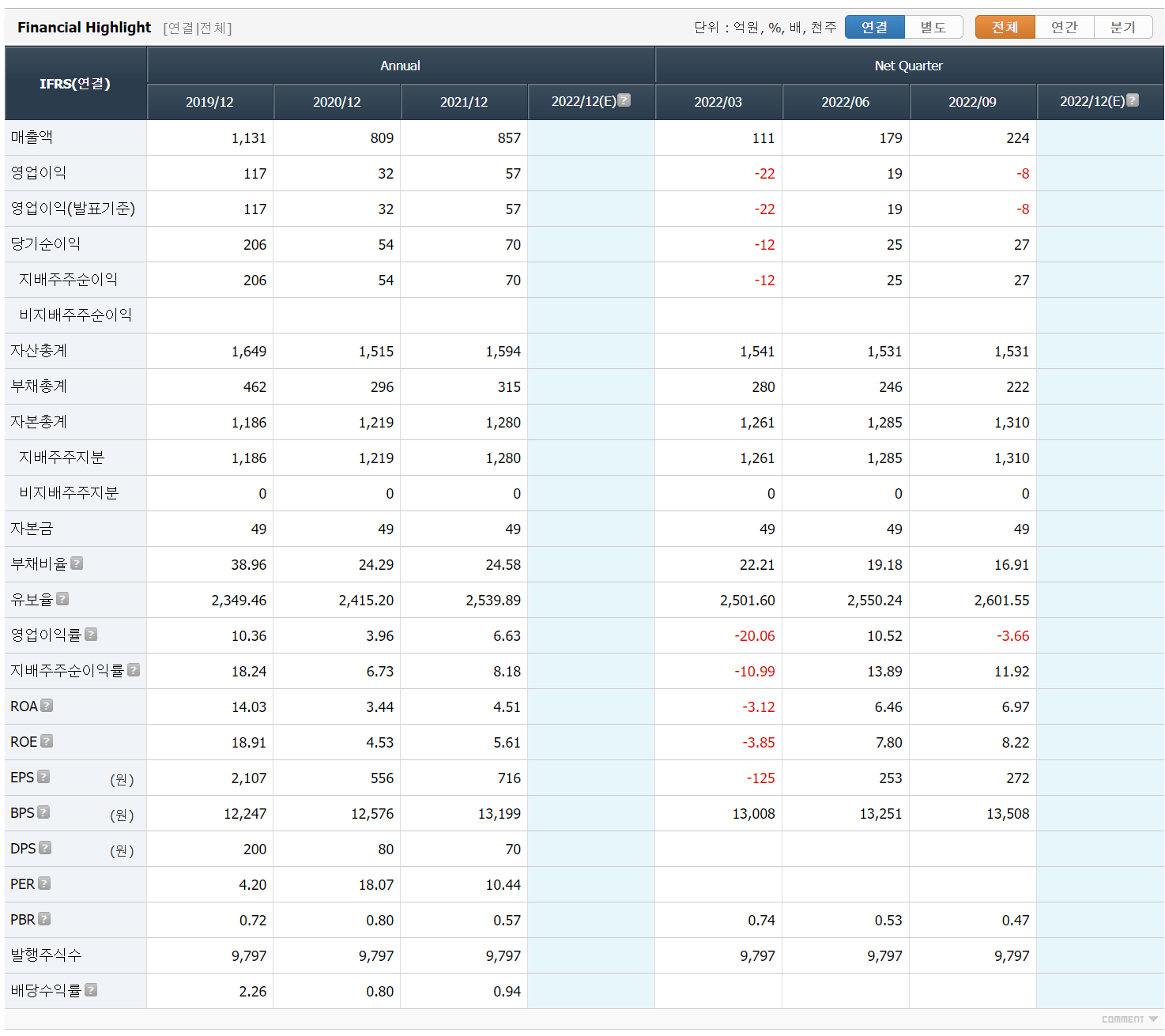 우리넷은 2019년 700억대 매출로 시작을 하여 2020년에는 520억 2021년에는 604억의 매출을 발생하였습니다. 영업이익과 당기순이익은 2020년 적자를 기록했다가 2021년 흑자전환하였습니다. 2022년 실적은 악화될 것으로 전망하고 있습니다. 유보율과 부채비율은 매우 우수한 편입니다.
