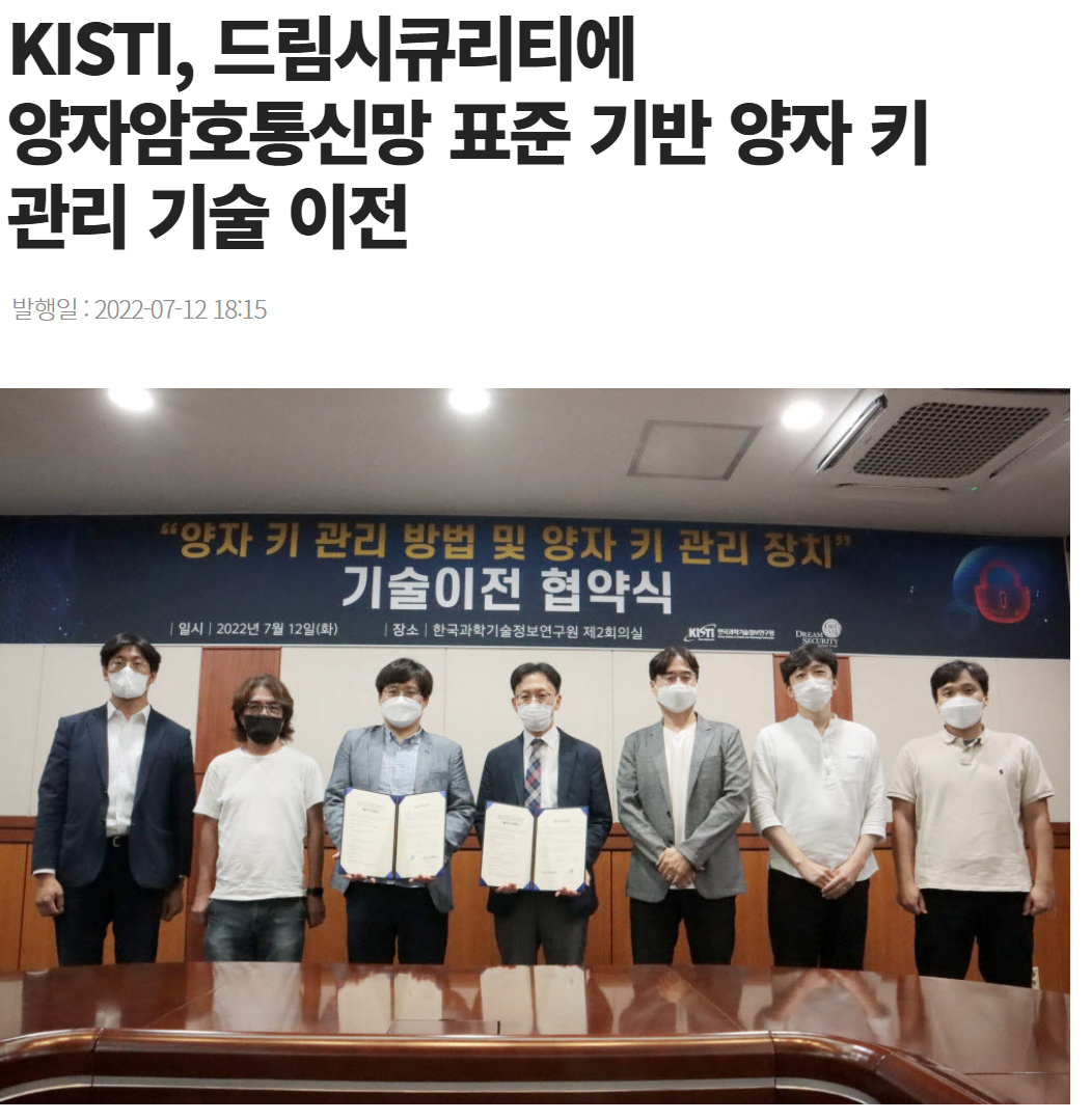 과 공동연구를 통해 ‘양자직접통신’ 기술을 세계 최초로 개발하고 구현했습니다. 한국과학기술정부연구원이 개발한 양자직접통신 기술은 KRISS와 NSR이 세계 최초로 제안한 독창적인 방식으로 암호와 메시지를 분리하지 않고 비밀 메시지를 양자채널을 통해 직접 전달할 수 있다고 합니다. 한국과학기술정보연구원은 암호 및 인증 소프트웨어 개발 전문기업 드림시큐리티와 ‘양자 키 관리 방법 및 양자 키 관리 장치 기술’에 대한 기술이전 협약을 체결했습니다. KISTI가 개발한 해당 기술은 최근 국내 특허로 출원이 완료되었습니다. 기술이전은 이번이 첫 사례로 드림시큐리티가 양자암호 시장에서 수혜를 받을 것으로 예상되어 관련주로 편입되었습니다.
