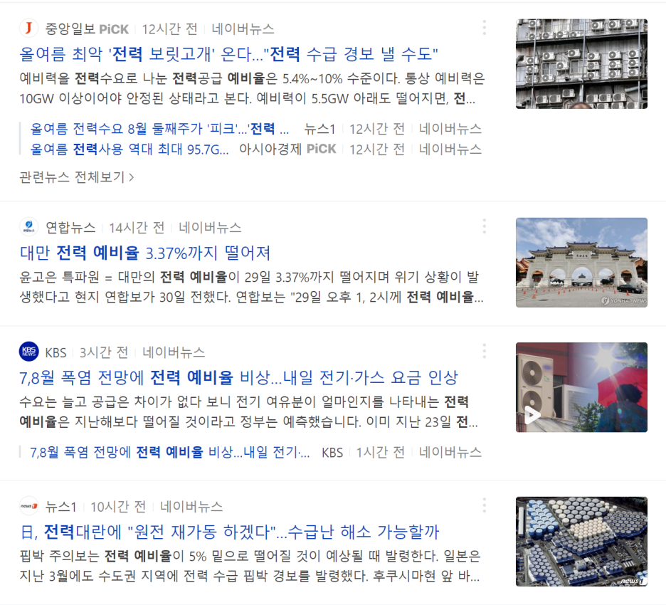 네이버에서 전력난이라는 단어로 뉴스를 검색해보면 아래와 같습니다.