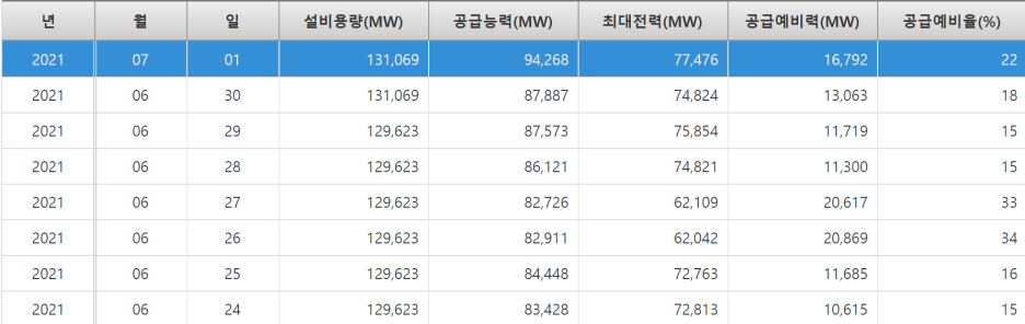 아래 표는 2021년 6월 말 수치입니다. 2021년 6월 말 최대전력이 77,476이었습니다.