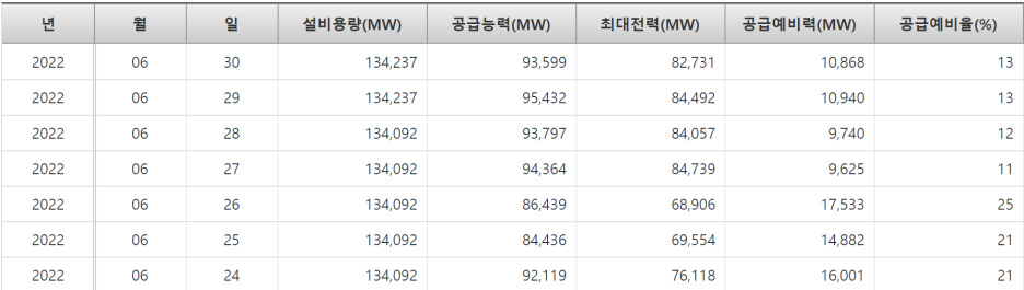 6월 말부터 급격하게 예비율이 떨어지는 걸 볼수 있습니다.