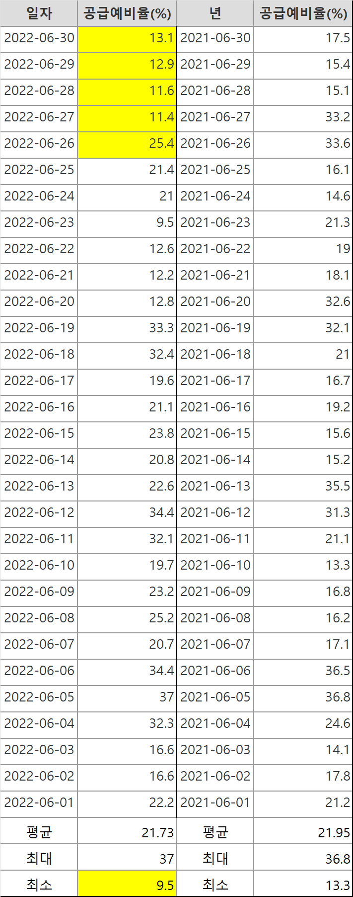 그리고 2022년 6월 예비율 최소값이 9.5%로 작년 최소값인 13.3%보다 낮습니다.