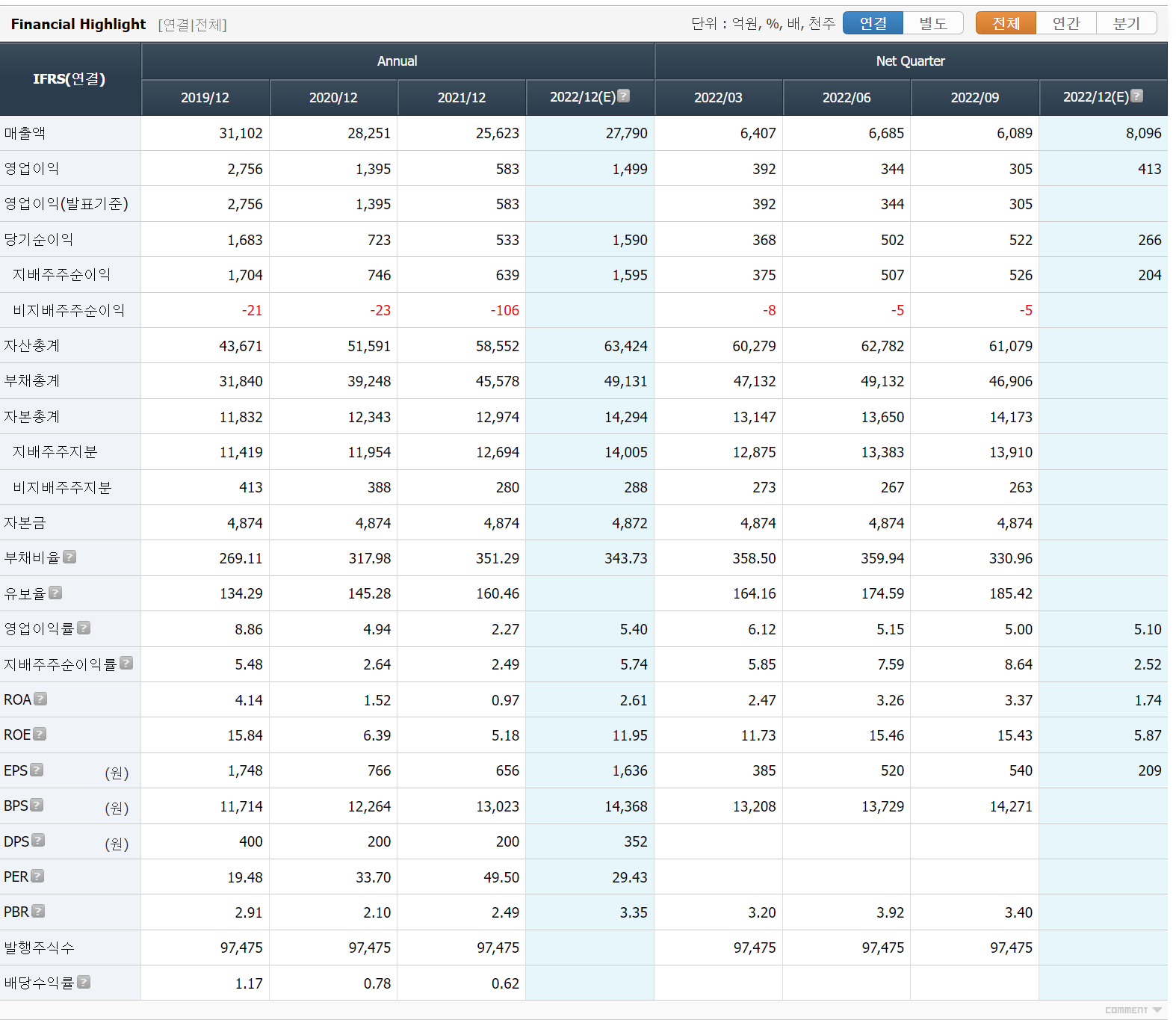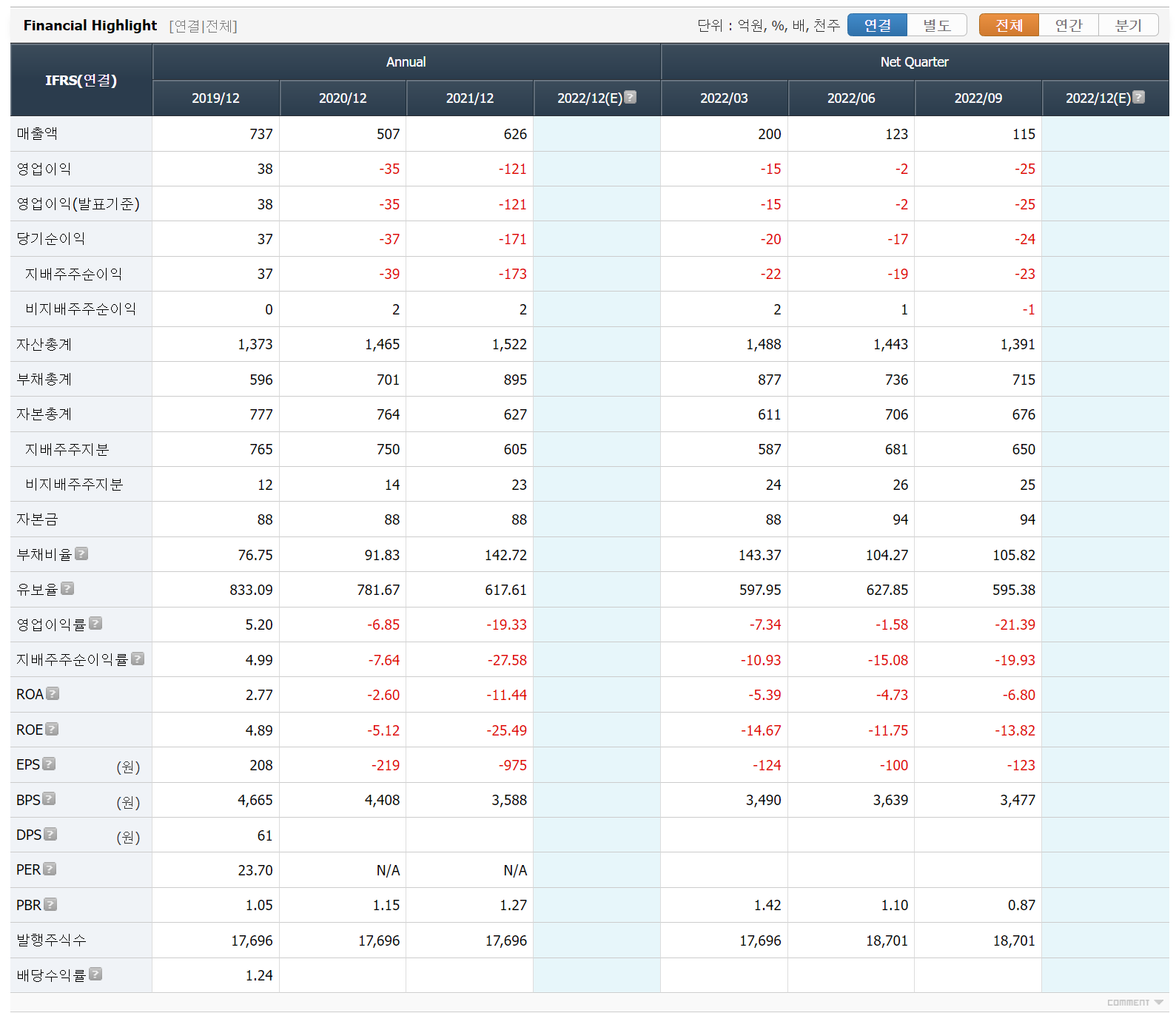 부채비율은 180.95, 유보율은988.44로 다소 아쉬운 수준을 유지하고 있습니다.