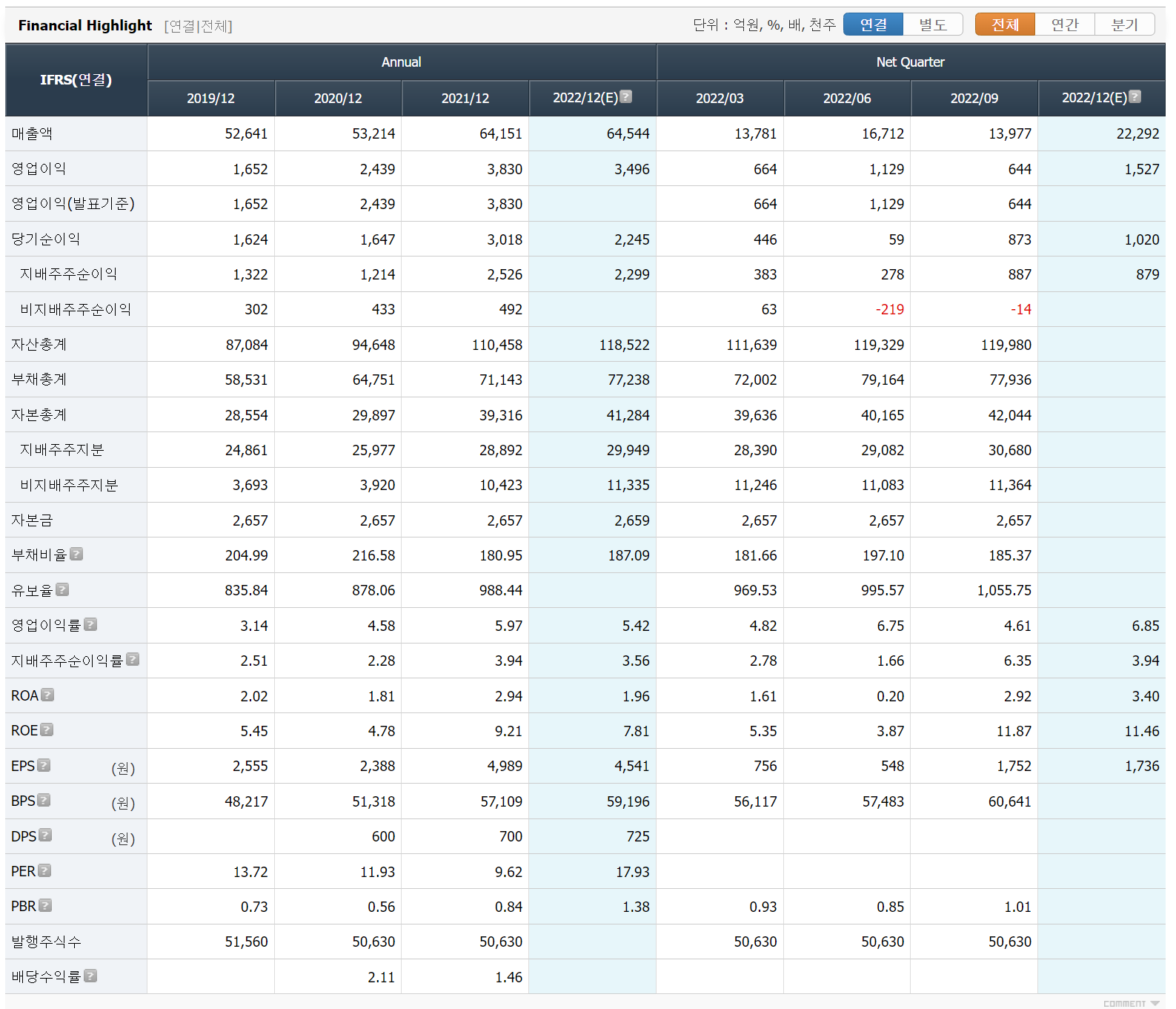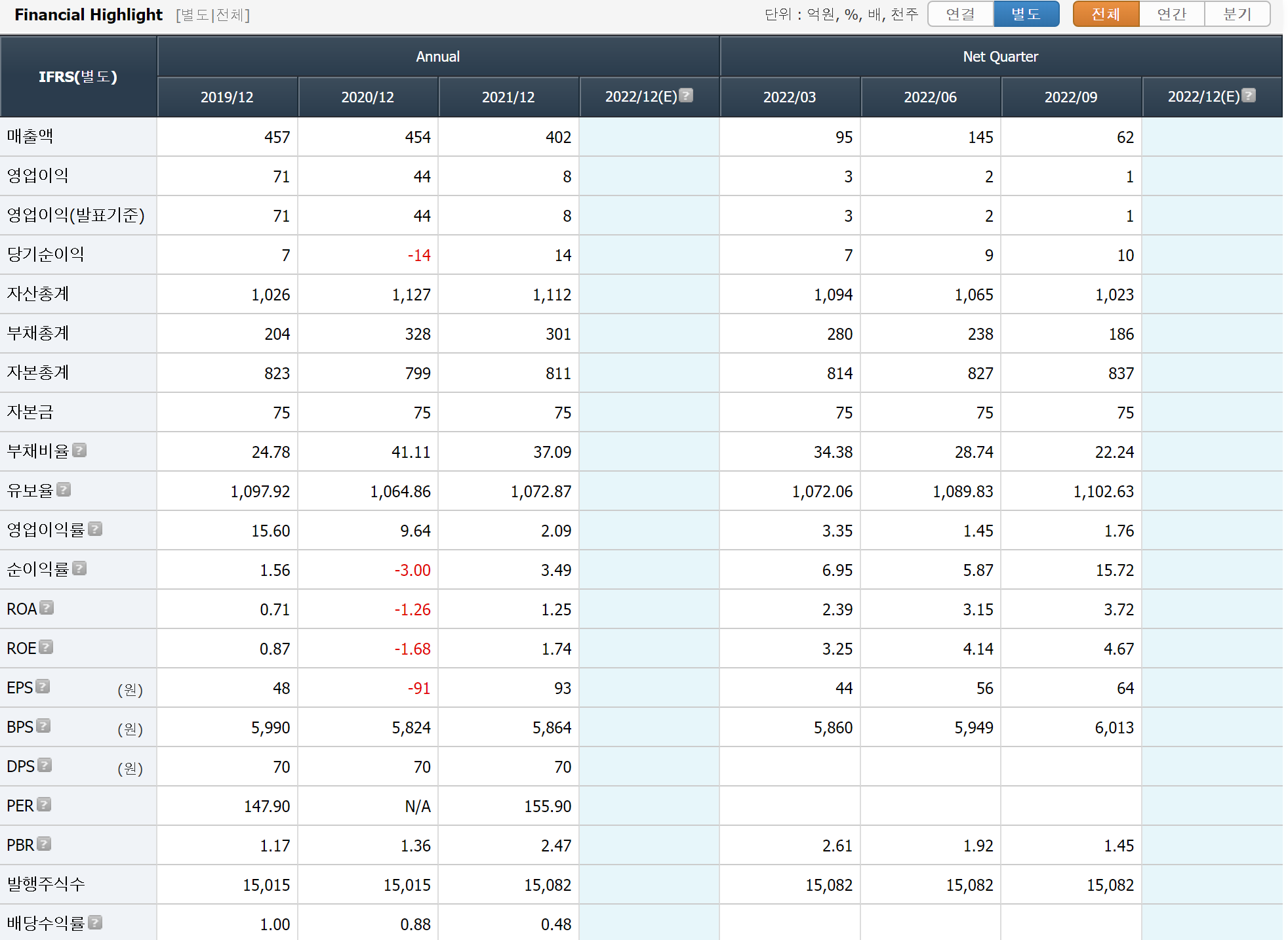 당기순이익은 2019년 22억, 2020년 17억, 2021년 58억을 기록하였습니다. 부채비율은 102.32, 유보율은725.03로 다소 아쉬운 수준을 유지하고 있습니다.