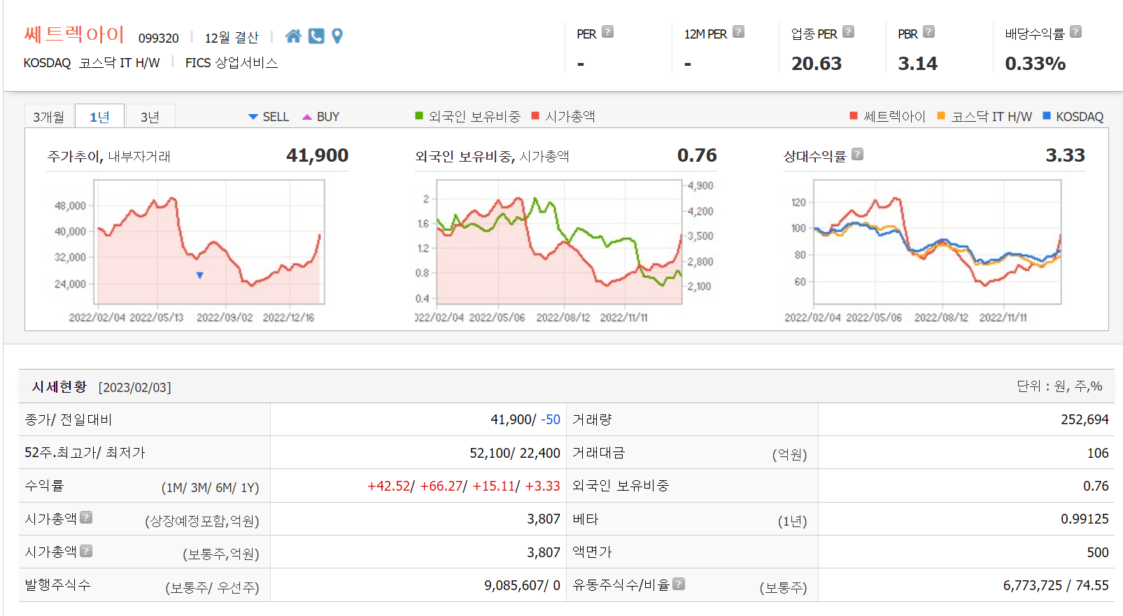 작성일 기준 시가총액은 3,807억 이며, 현재가는 41,900원 입니다.