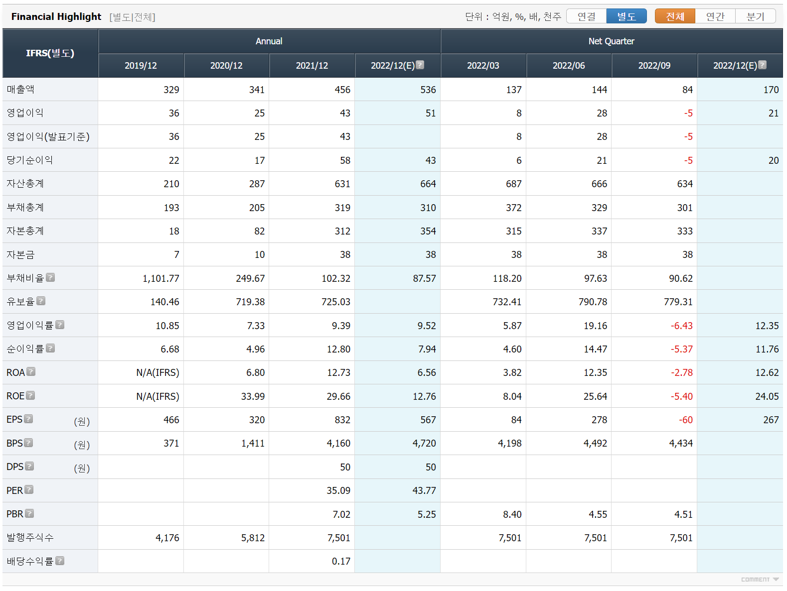 당기순이익은 2019년 22억, 2020년 17억, 2021년 58억을 기록하였습니다. 부채비율은 102.32, 유보율은725.03로 다소 아쉬운 수준을 유지하고 있습니다.