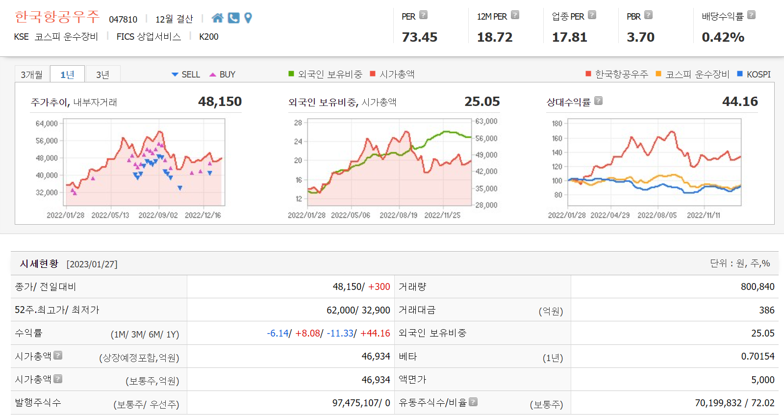 동사는 KOSPI 시장에 2011/06/30에 상장한 기업이며 종목코드는 047810입니다. 작성일 기준 시가총액은 47,227억 이며, 현재가는 48,450원 입니다. 한국항공우주와 종속회사는 항공기, 우주선, 위성체, 발사체 및 동 부품에 대한 설계, 제조, 판매, 정비 등의 사업을 영위하고 있습니다. 군수사업의 대부분은 내수로 구성되며 수요자인 한국정부(방위사업청)와 계약을 통해 제품(군용기)의 연구개발, 생산, 성능개량, 후속지원 등을 수행하고 있습니다. 항공산업은 군용기, 민항기, 헬기 등 항공기를 개발하고 개발된 항공기를 양산하는 항공기 제조산업과 운영되는 항공기의 정비 및 개조를 담당하는 MRO산업으로 구분하고 있습니다.