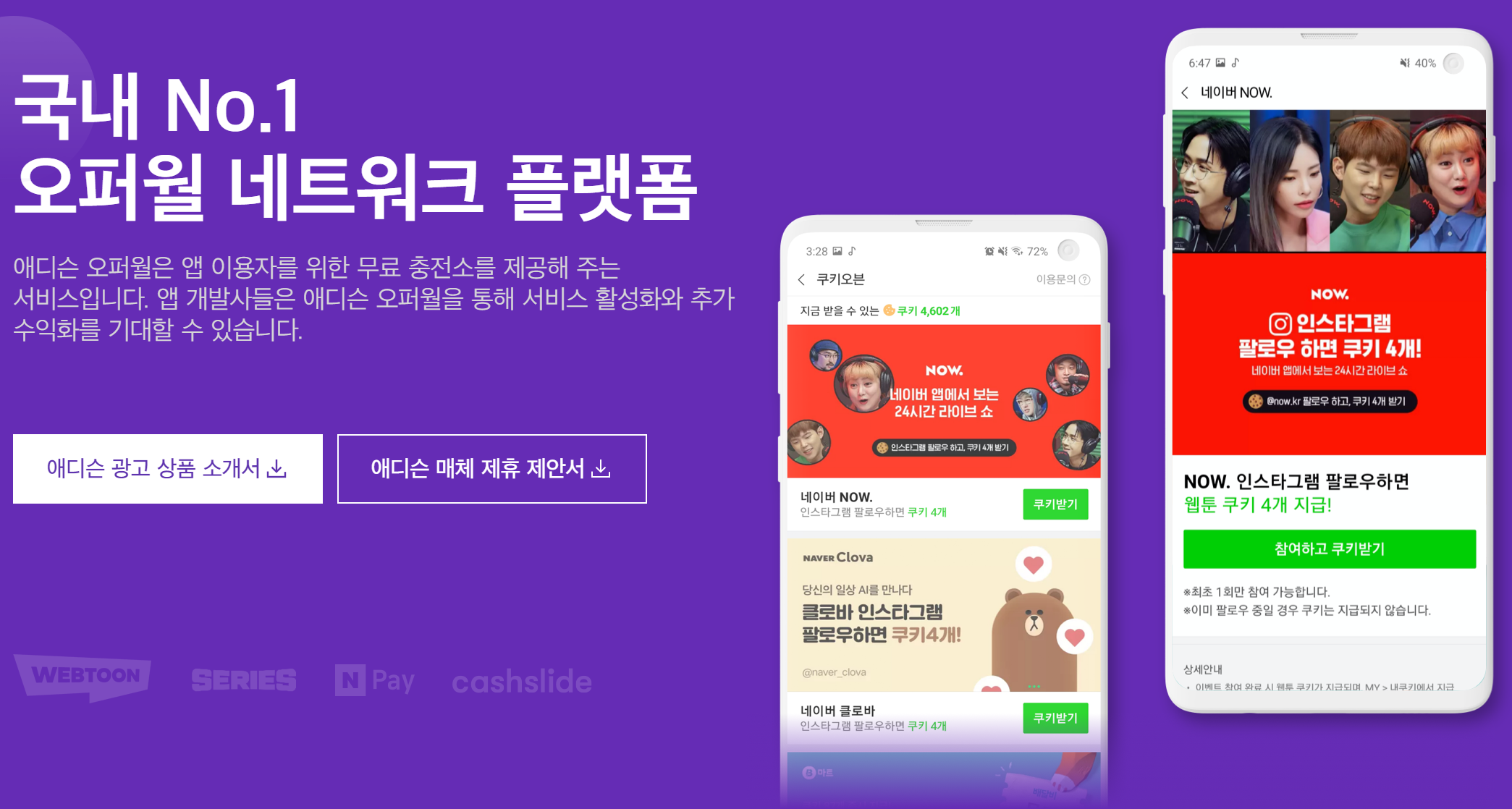 현재 애디슨 오퍼월이 적용된 대표적 사례로는 네이버웹툰, 네이버시리즈의 무료 쿠키 충전소인 '쿠키오븐'과 네이버페이의 '포인트 혜택'이 있으며 네이버 웹툰 쿠키 서비스로 인하여 웹툰 관련주로 편입되어 있습니다.