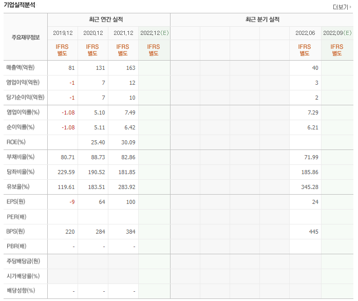 매년 100억 내외의 매출을 발생시키고 있으며 부채비율과 유보율 모두 준수한 편입니다. 매출이 지속적으로 증가 추이인 것이 특이점입니다.