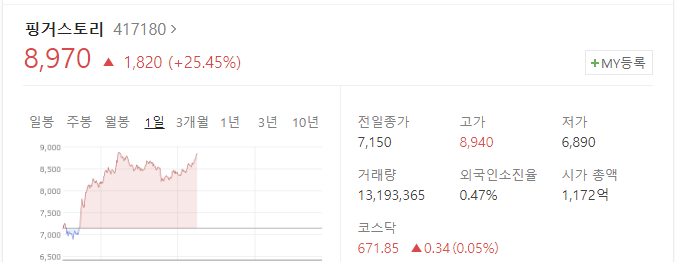 핑거스토리는 국내 최초의 남성향 정통 무협, 액션 전문 웹툰 플랫폼 '무툰'과 여성들을 위한로맨스 & BL 전문 콘텐츠 플랫폼 '큐툰' 서비스를 운영하고 있어 웹툰 관련주로 편입되어 있습니다.