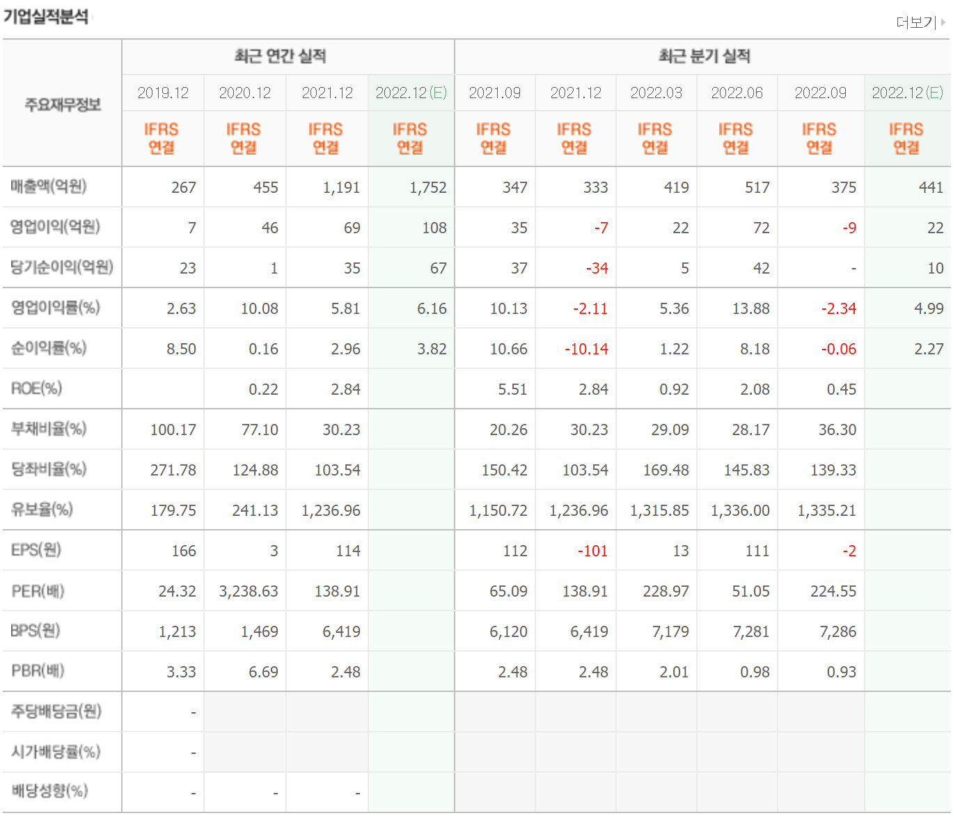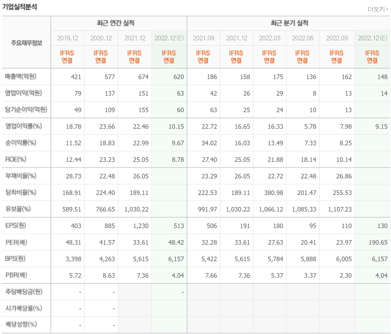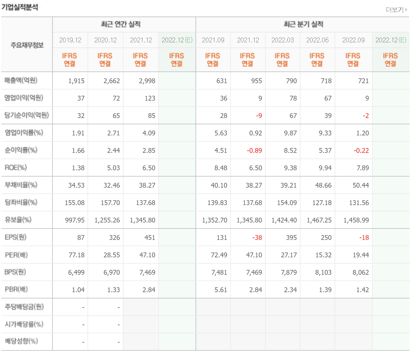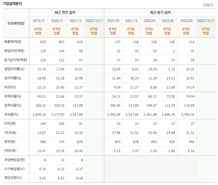 2019년 1900억대 매출에서 2020년부터 2000억 중후반의 매출을 달성하고 있으며 영업이익과 당기순이익 모두 3년 연속 흑자이며 그 증가폭도 커지고 있는 상태입니다. 유보율과 부채비율 역시 준수한 수준을 유지하고 있습니다.