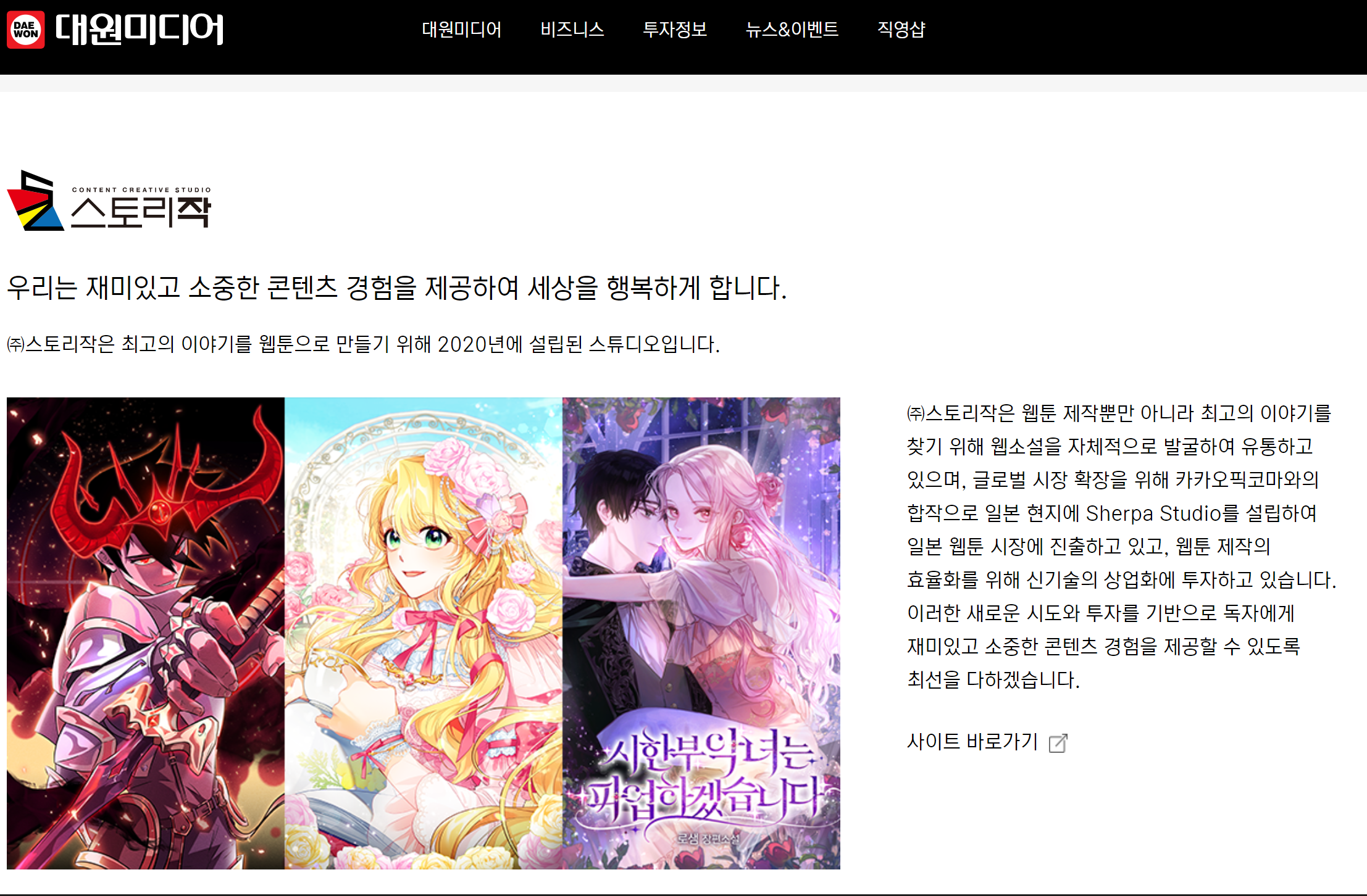 2020년에는 그룹 차원에서의 웹툰 및 웹소설 사업 강화를 위해 [스토리작]을 설립하였습니다. [스토리작]은 웹툰 제작 전문 스튜디오로, 언택트 시대에 접어들어 전세계적으로 중요한 콘텐츠 사업으로 자리 잡은 웹툰 사업에 대한 시장 경쟁력 강화를 주요 목표로 삼고 있습니다.웹툰 사업 전개에 있어서 자체 역량을 통한 웹툰 및 웹소설 제작 뿐만 아니라 신인 작가 발굴을 통한 협업 사업도 병행해 웹툰을 비롯한 다양한 부가 사업을 함께 전개하고자 합니다.