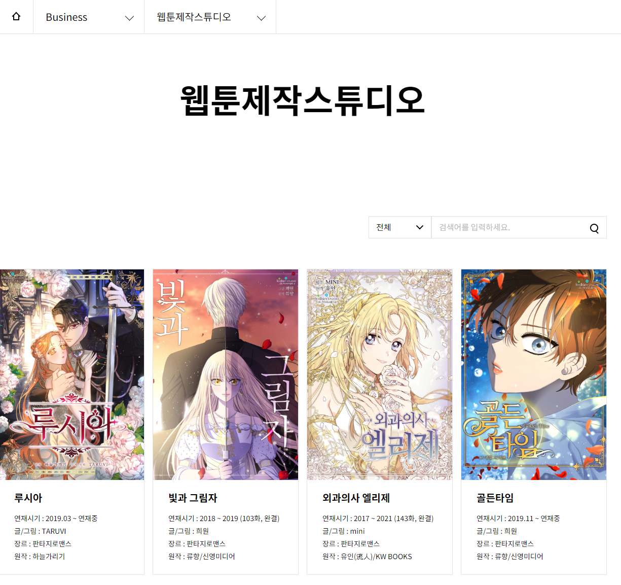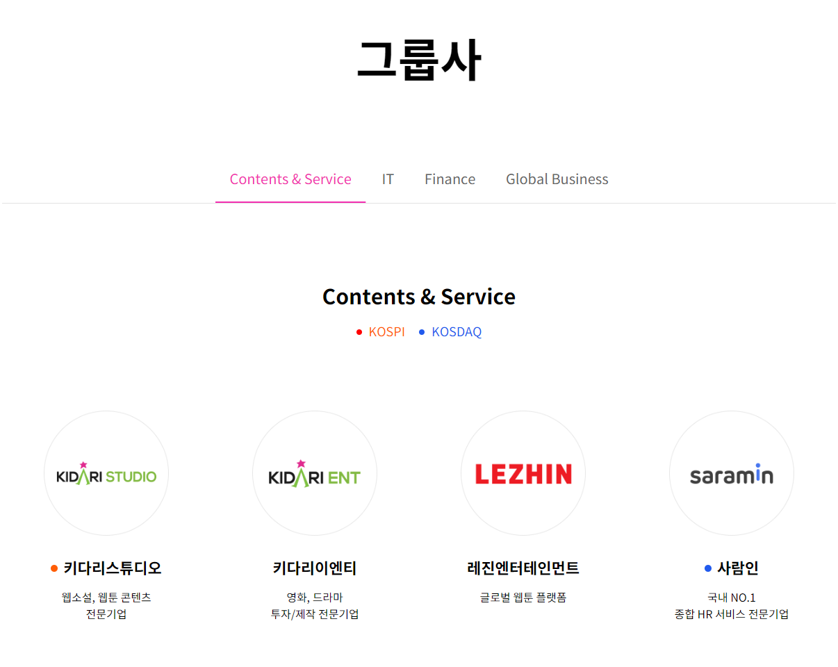 다양한 미디어를 통해 디지털라이프를 창조하는 콘텐츠 전문기업으로 사업군별로 보면 웹툰 사업부문, 웹소설 사업부문으로 구성되어 있습니다. 21년 12월 키다리이엔티 흡수합병을 완료하여 콘텐츠의 영상 제작 기능을 내재화하였습니다.