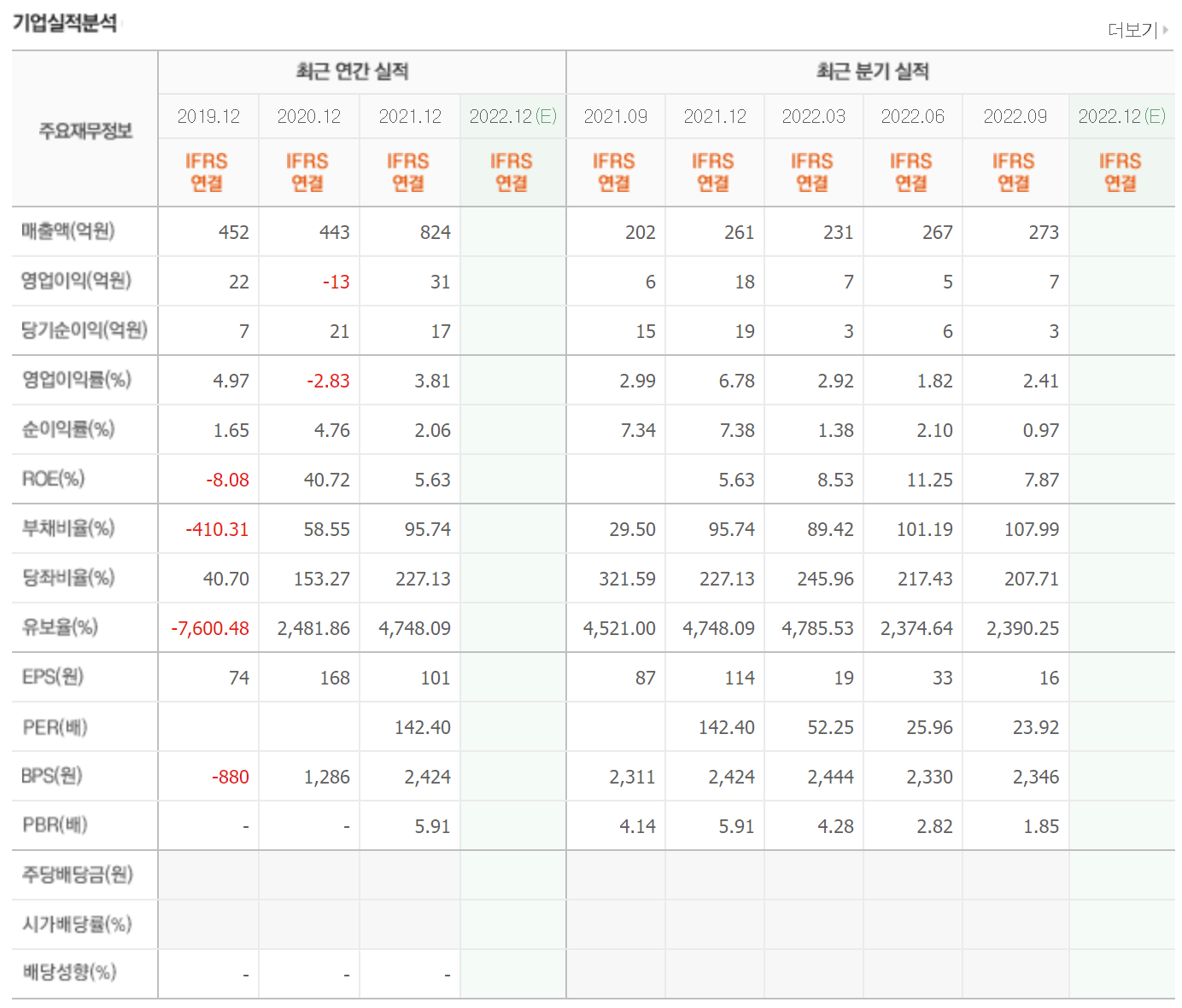 매출은 2019년과 2020년 400억대를 유지하다 2021년 800억대로 2배 정도 성장하였고 당기순이익도 지속적으로 흑자를 유지하고 있습니다 .유보율은 4700대로 매우 높은 수준을 유지하고 있으며 부채비율은 95로 낮은 수준입니다.
