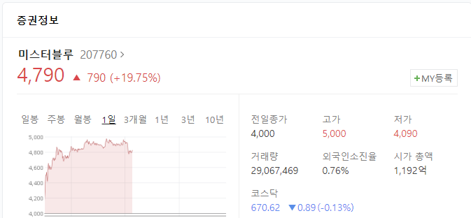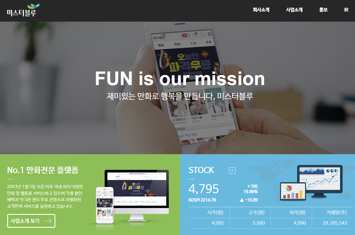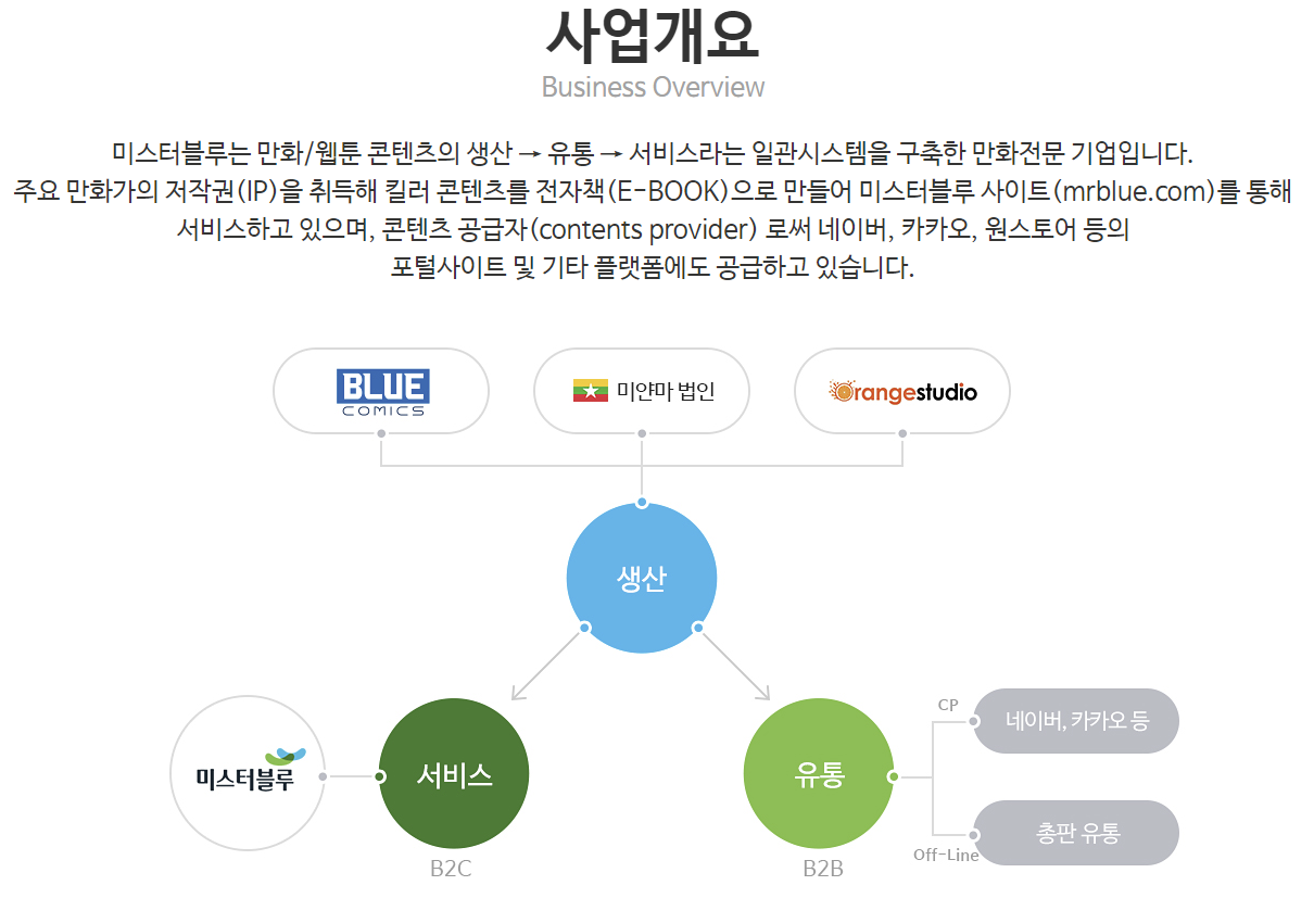 미스터블루는 온라인 만화 제작ㆍ유통업 및 만화출판업 영위 목적으로 2002년 11월 설립되어 2015년 11월 동부제2호SPAC과 합병하면서 우회 상장하였습니다. 국내에서 유일하게 웹툰 콘텐츠를 자체 제작 후 직접 유통과 서비스를 담당하는 콘텐츠 플랫폼 기업입니다. 2022년 웹소설 전문업체인 동아미디어와 영상출판미디어를 인수하였고 EOS게임 인수를 통해 게임사업에 진출하였으며, 게임사업부문을 분할하여 2018년 10월 블루포션게임즈를 설립하였습니다.
